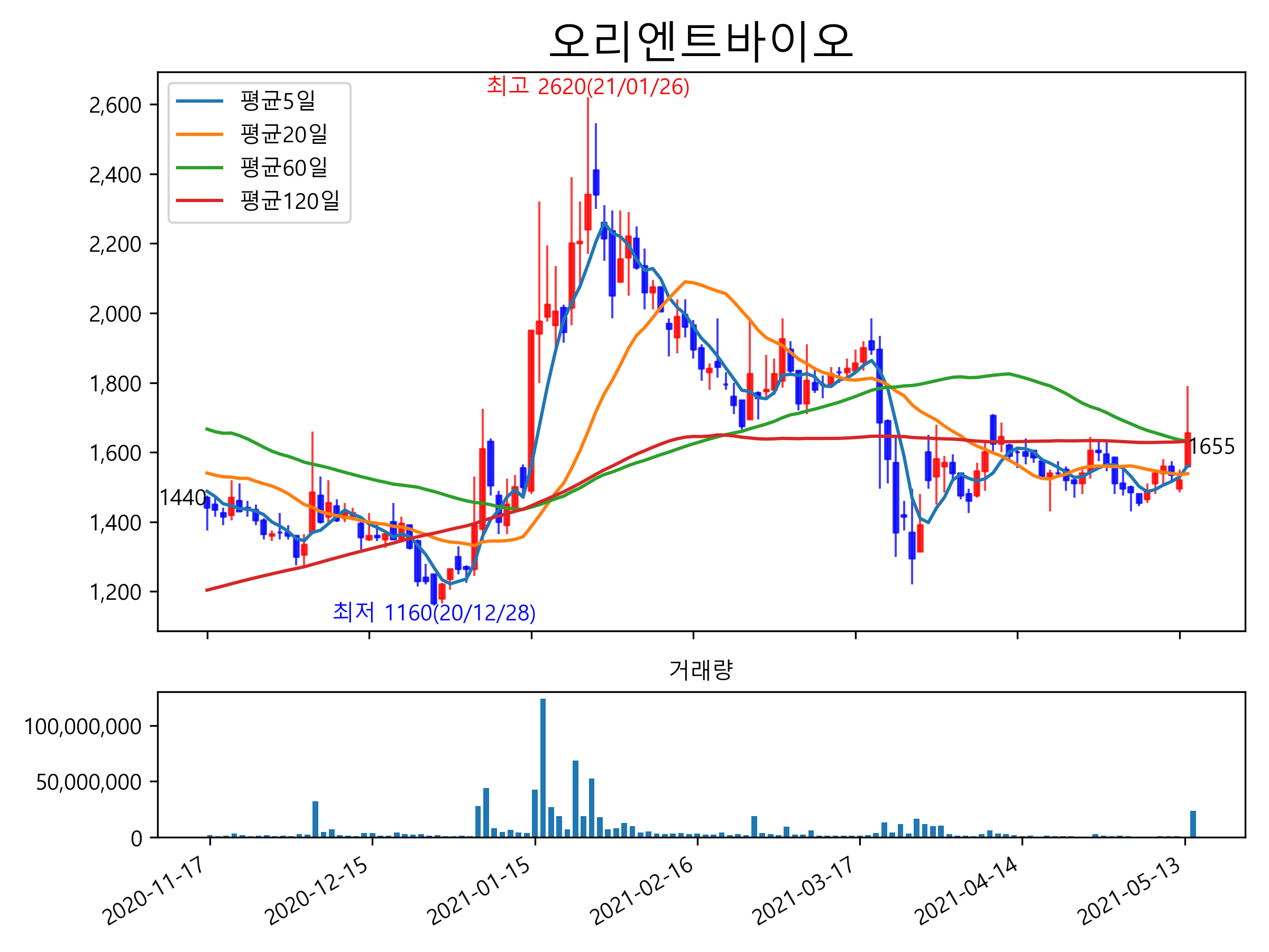 최근 6개월간 캔들차트 및 이동평균선입니다.
