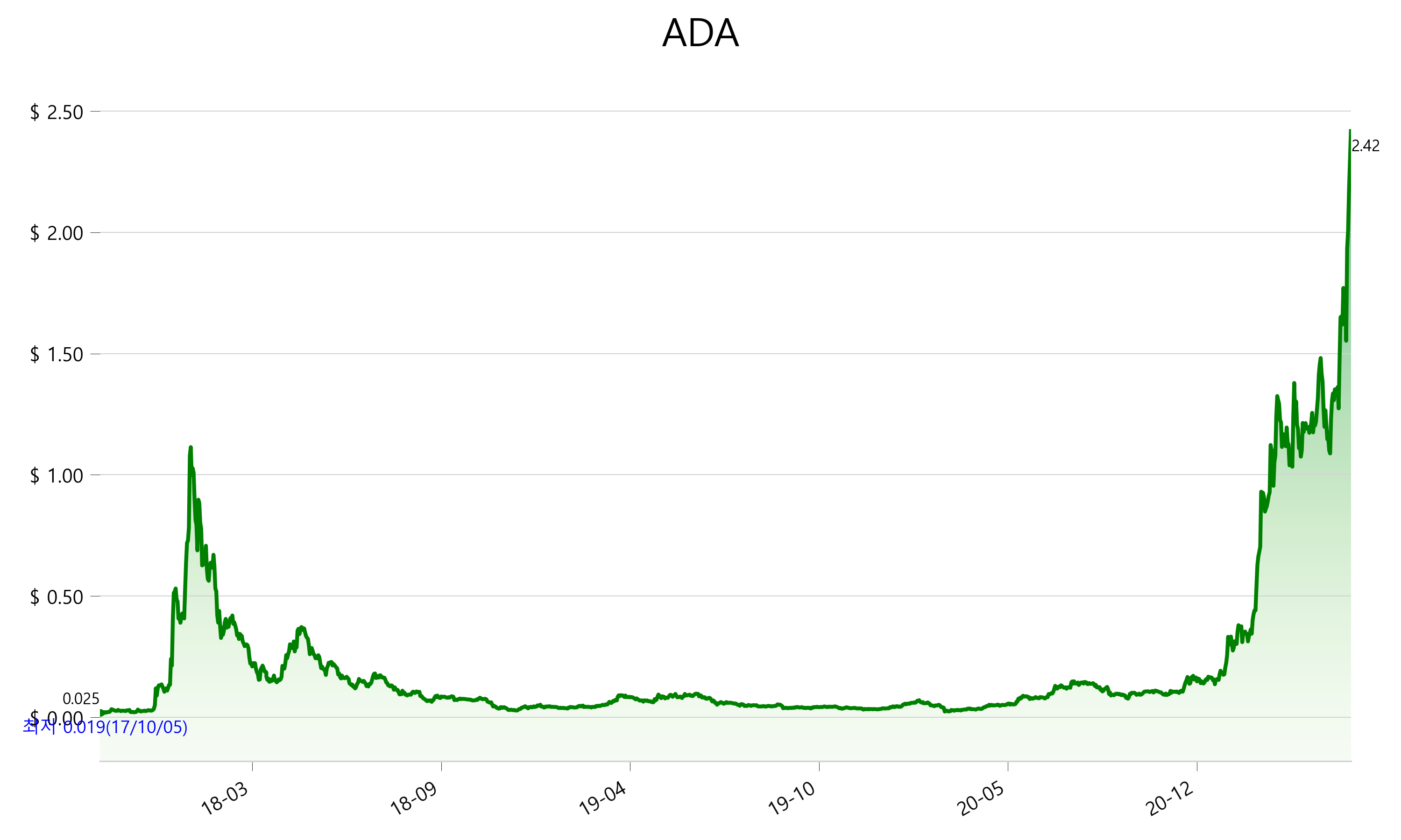 에이다는 2017년 말 가상화폐 폭등시 1.2달러 가까이 올라갔지만 이후 폭락해서 0.02달러까지 갔지만 2021년들어서 2달러 넘게 급등한 상태입니다.