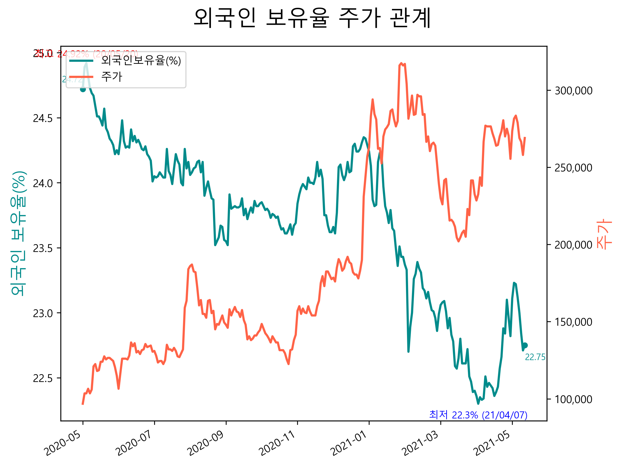 최근 1년간 외국인 보유율 및 주가와의 관계입니다.