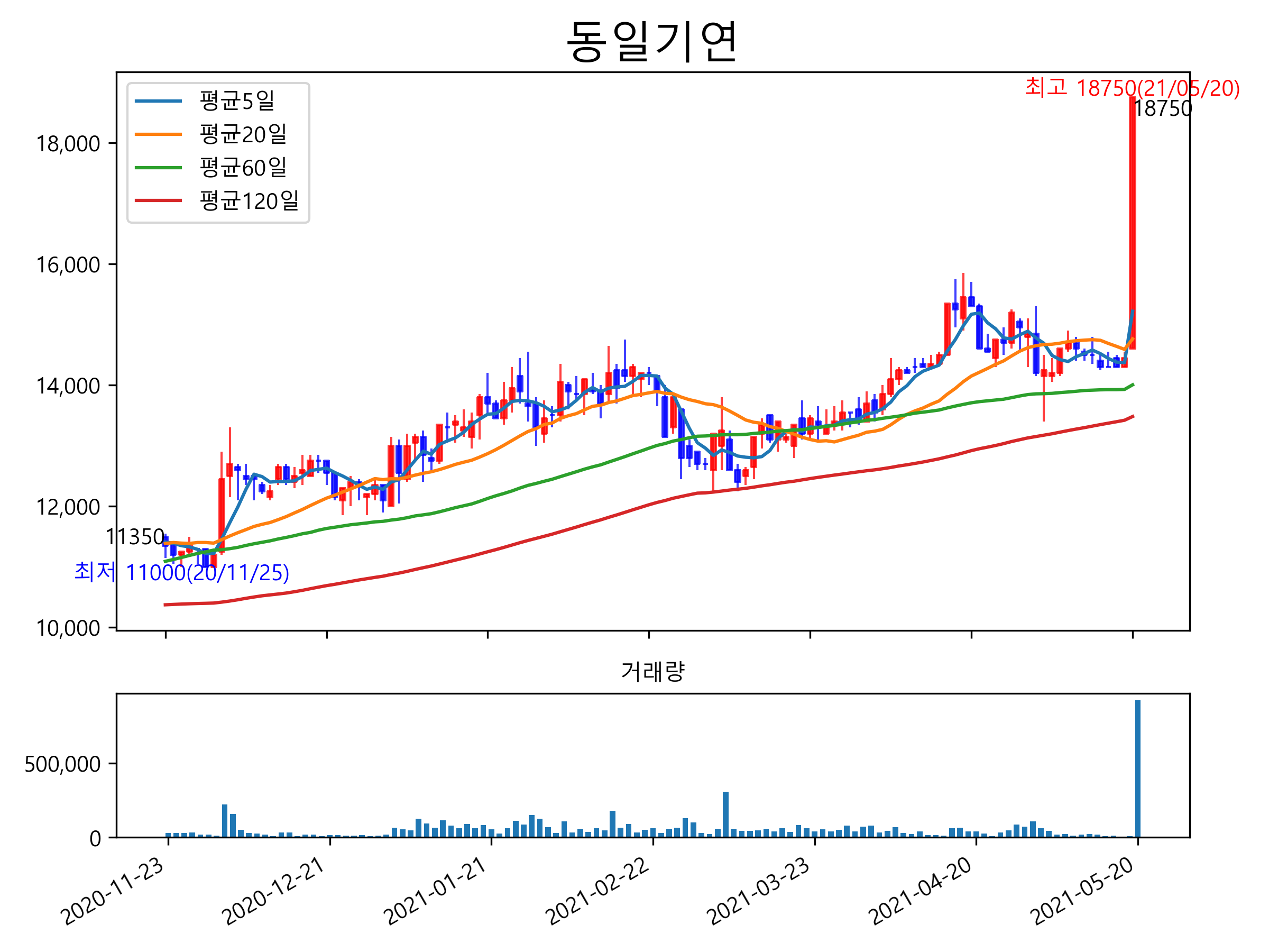 최근 6개월간 캔들차트 및 이동평균선입니다.