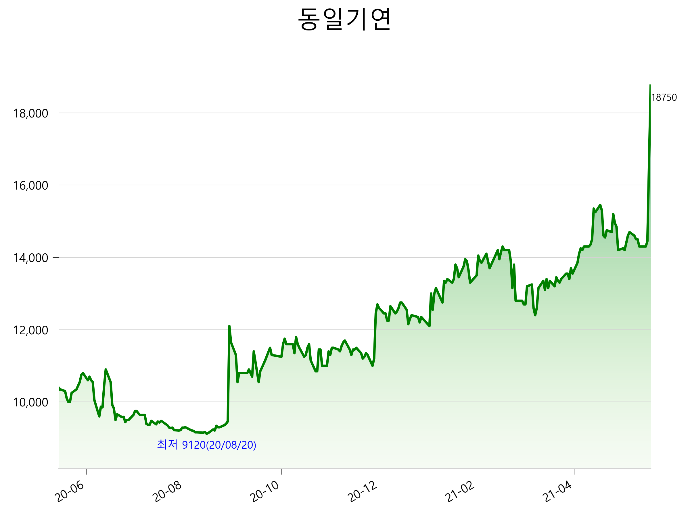 52주 최고가는 18,750원(2021-05-20), 52주 최저가는 9,120원(2020-08-20)으로 52주간 주가 상승률은 80.3% 입니다.