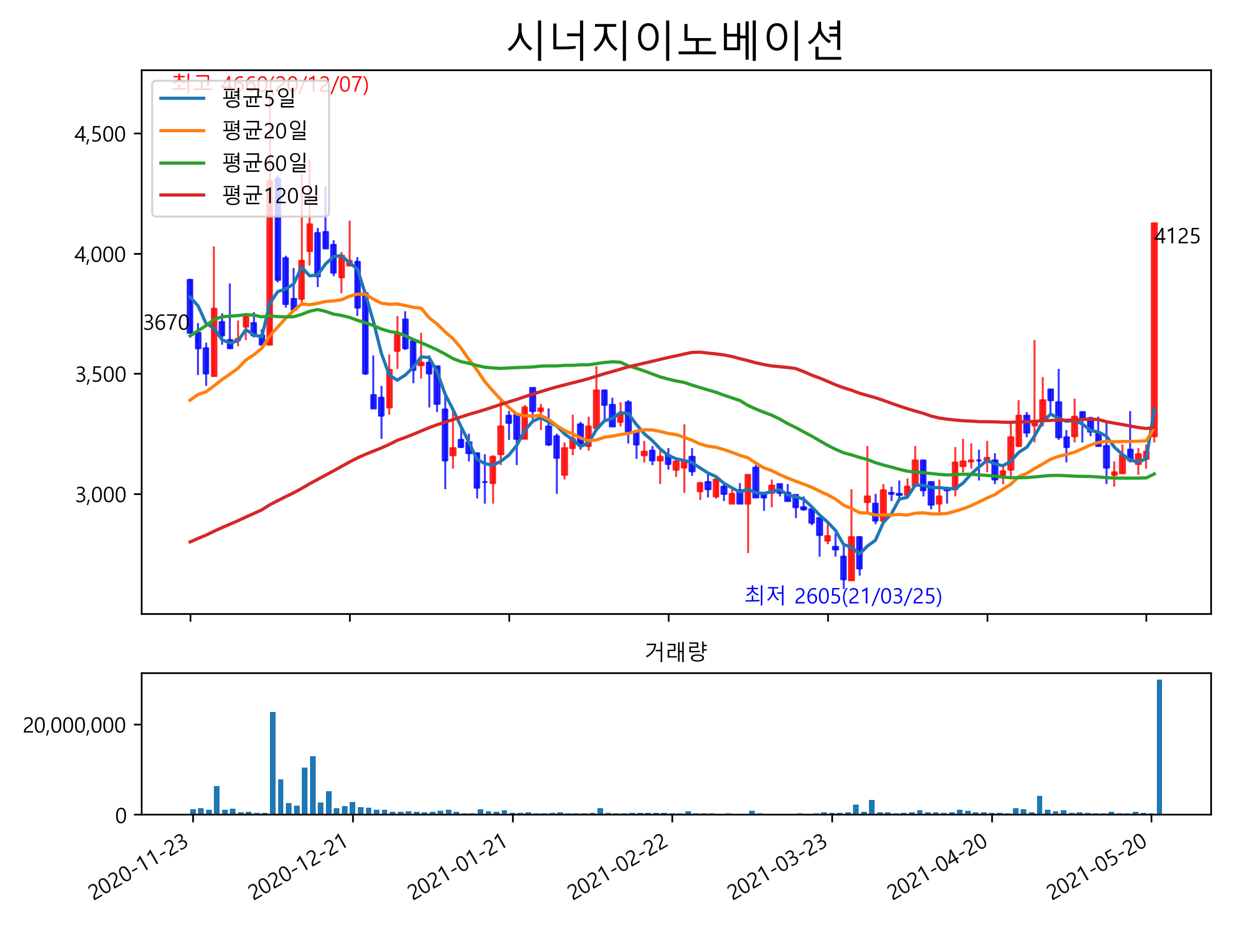 최근 6개월간 캔들차트 및 이동평균선입니다.