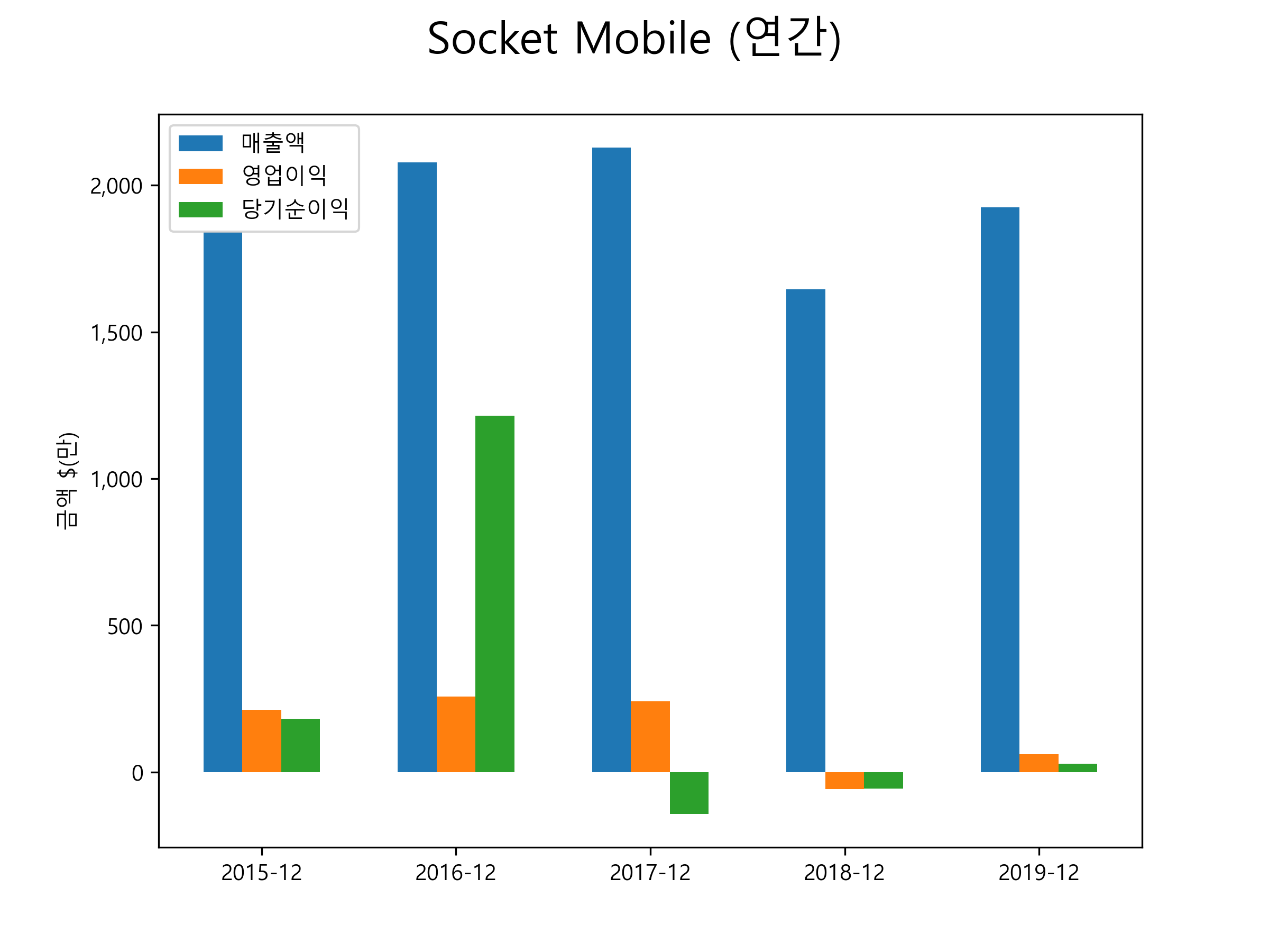 Socket Mobile의 2019년 매출은 1925.3억달러, 영업이익 60.6억달러, 당기순이익 28.7억달러을 기록했습니다. 연간별 매출 및 영업이익, 당기순이익 표입니다.