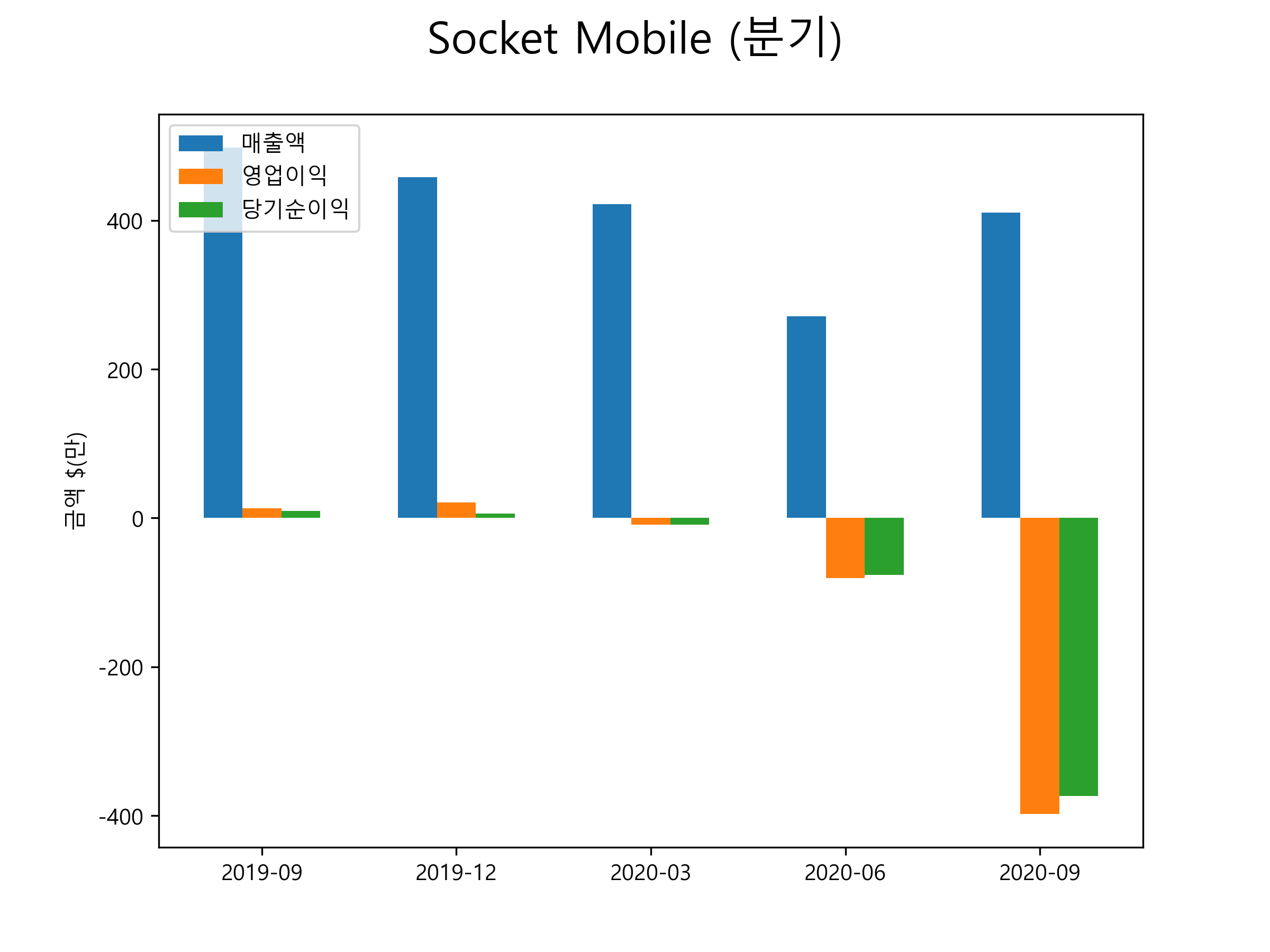Socket Mobile의 2020년 3분기 매출은 410.9억달러, 영업손실 -397.8억달러, 당기순손실 -373.8억달러을 기록했습니다. 분기별 매출 및 영업이익, 당기순이익 표입니다.