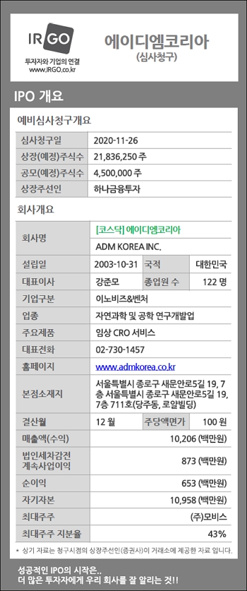 임상시험수탁기관(CRO) 기업인 에이디엠코리아(187660)가 상장일정에 돌입합니다. 에이디엠코리아의 상장에 대해 자세하게 알려드리겠습니다.
