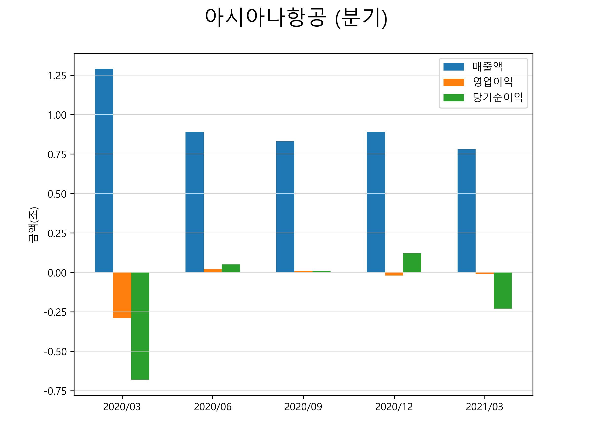 아시아나항공의 2021년 1분기 매출은 7834억원, 영업손실 -112억원, 당기순손실 -2304억원을 기록했습니다. 분기별 매출 및 영업이익, 당기순이익 표입니다.