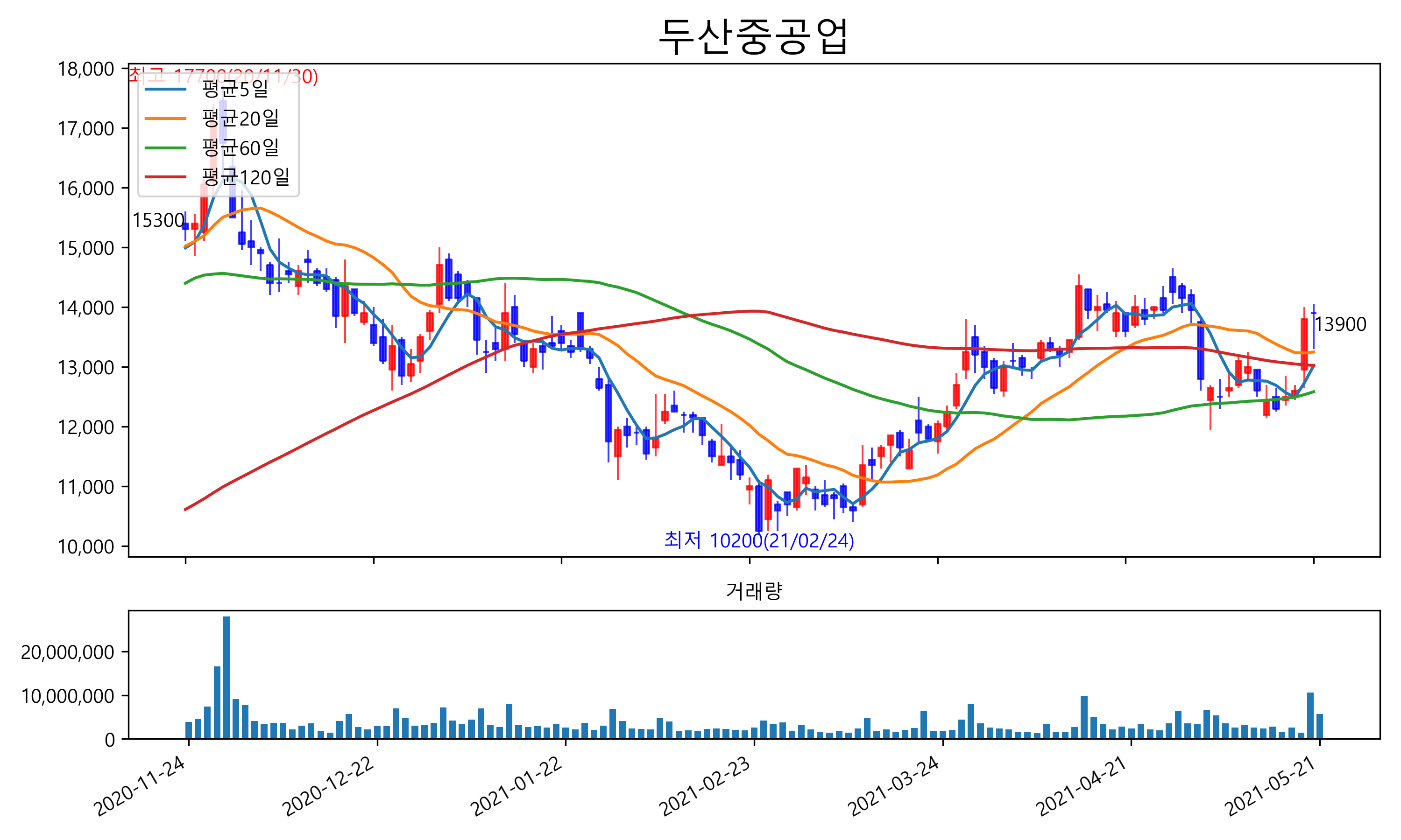 최근 6개월간 캔들차트 및 이동평균선입니다.