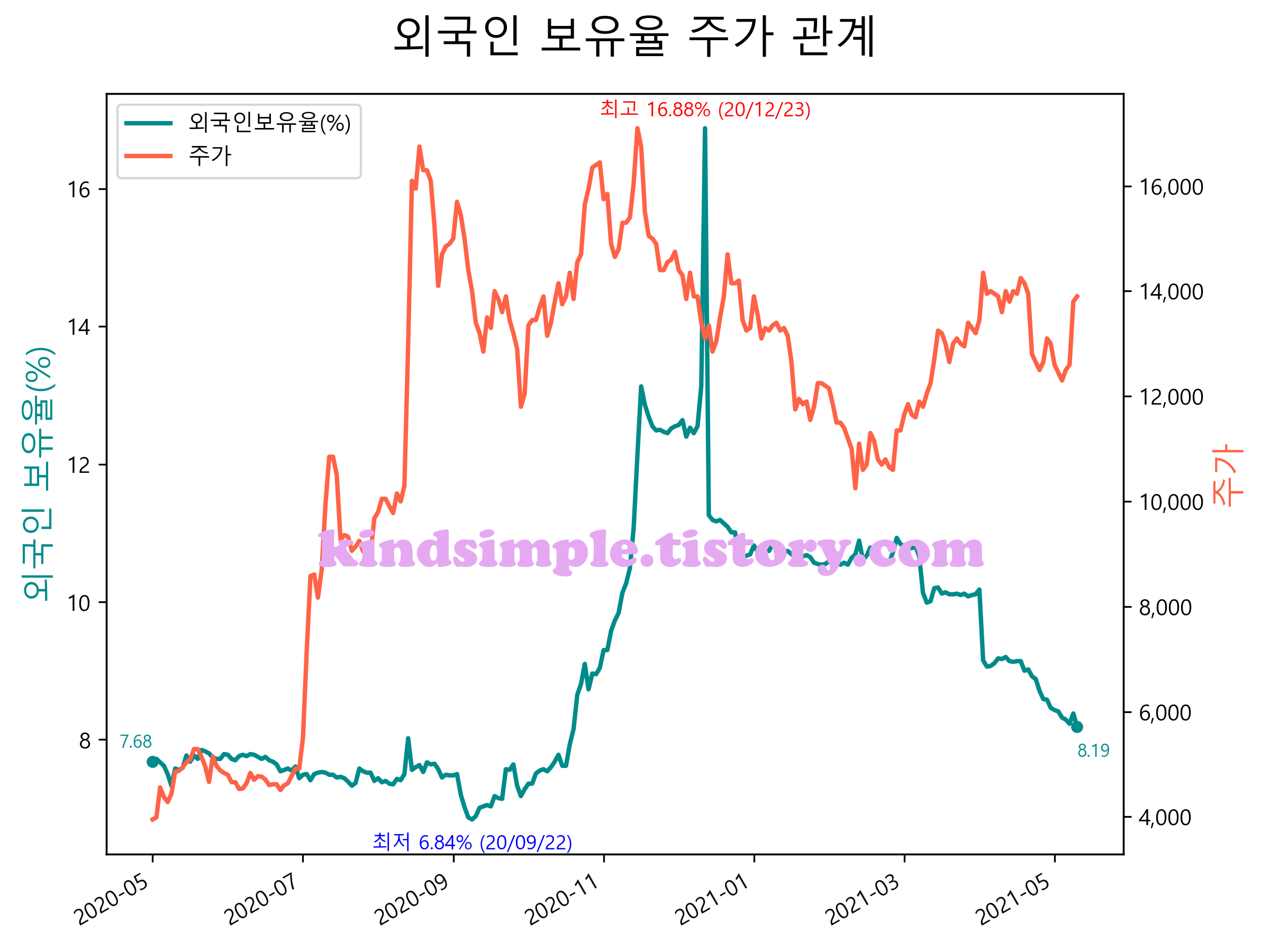 최근 1년간 외국인 보유율 및 주가와의 관계입니다.