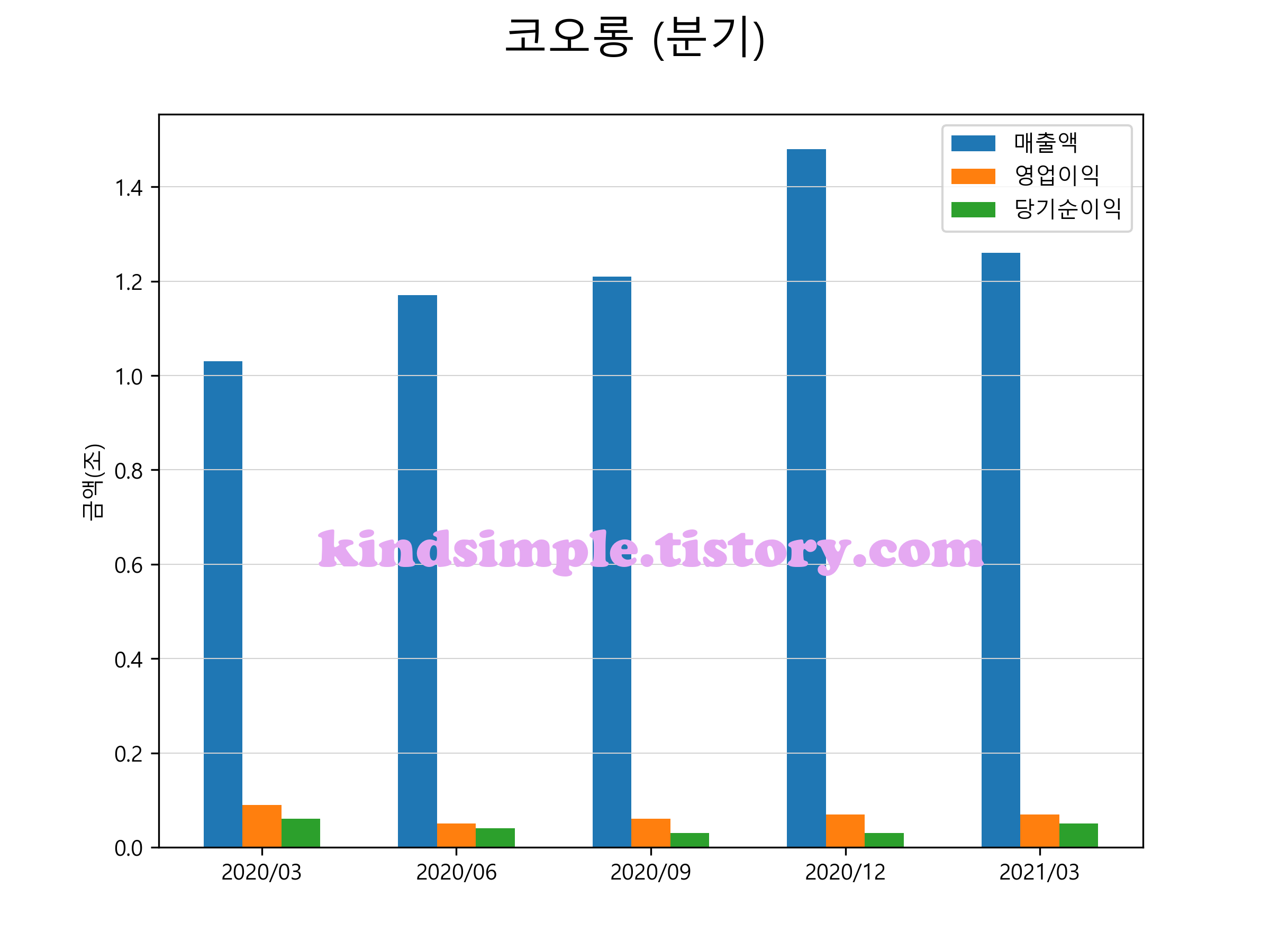 코오롱의 2021년 1분기 매출은 1조 2551억원, 영업이익 666억원, 당기순이익 451억원을 기록했습니다. 분기별 매출 및 영업이익, 당기순이익 표입니다.