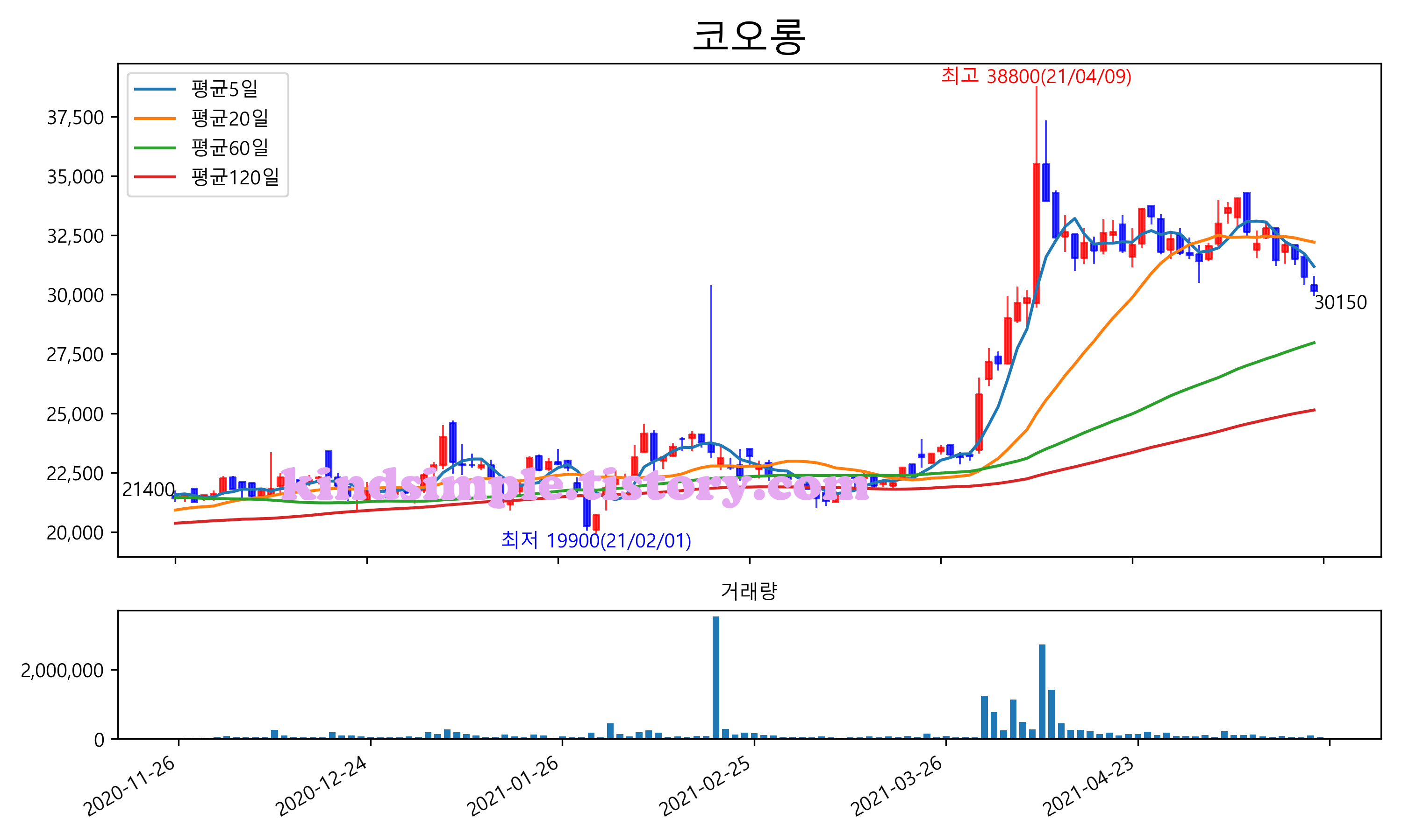 최근 6개월간 캔들차트 및 이동평균선입니다.