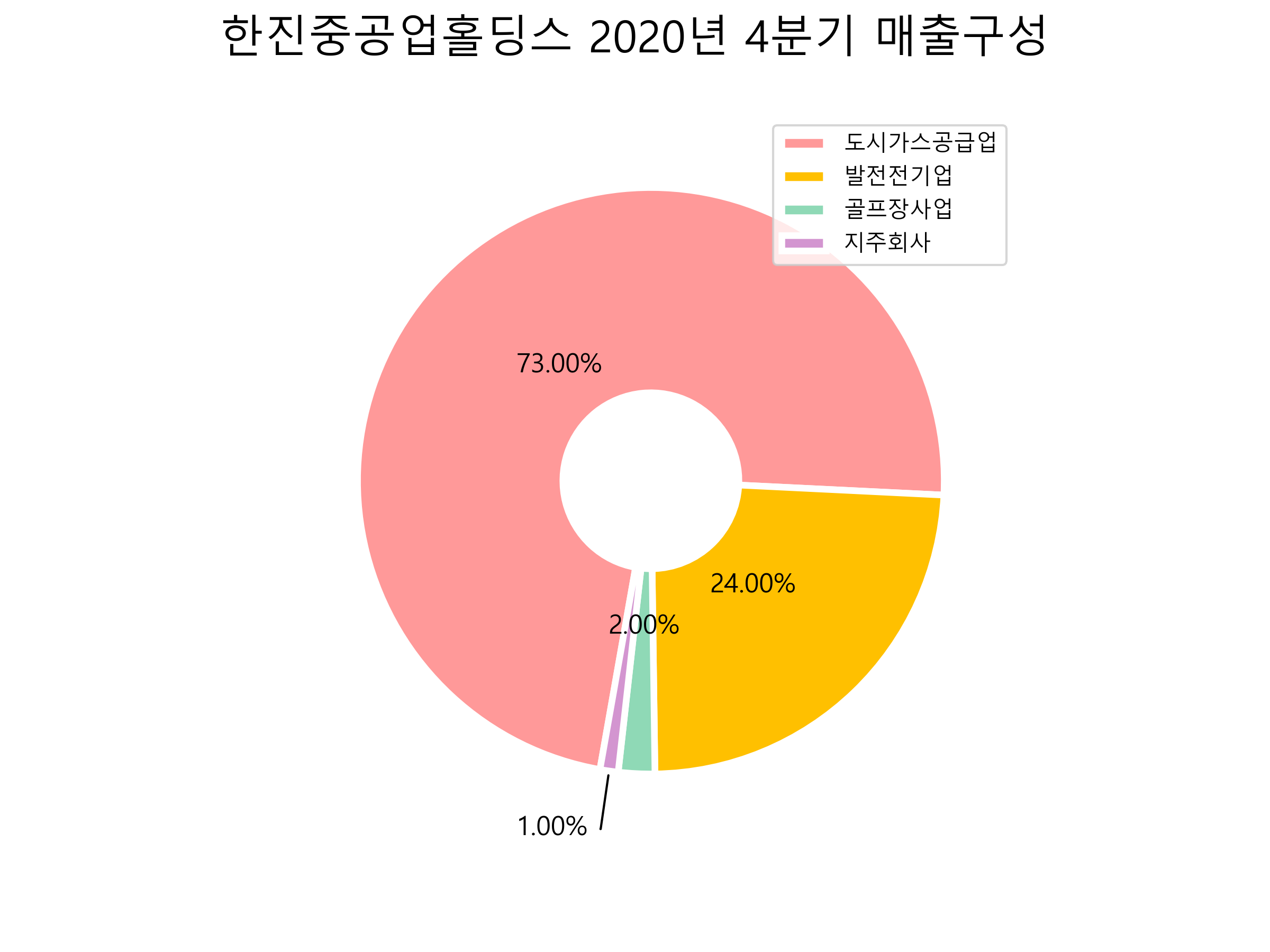 - 매출은 도시가스공급업 73.40%, 발전전기업 24.43%, 골프장사업 2.59% 등으로 이루어져 있음.