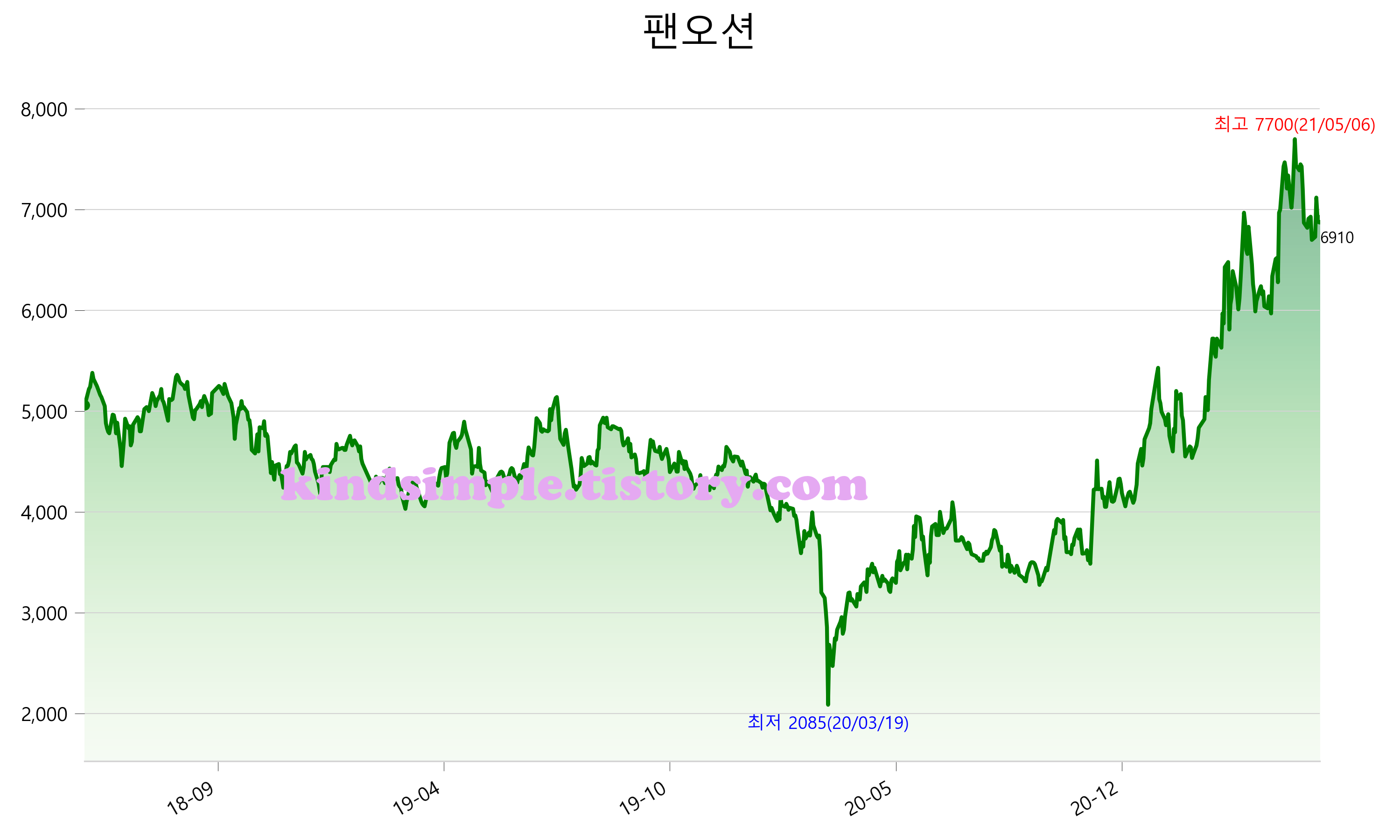 5월 29일 기준 주가는 6,910원 입니다. 아래는 최근 3년간의 주가흐름입니다.