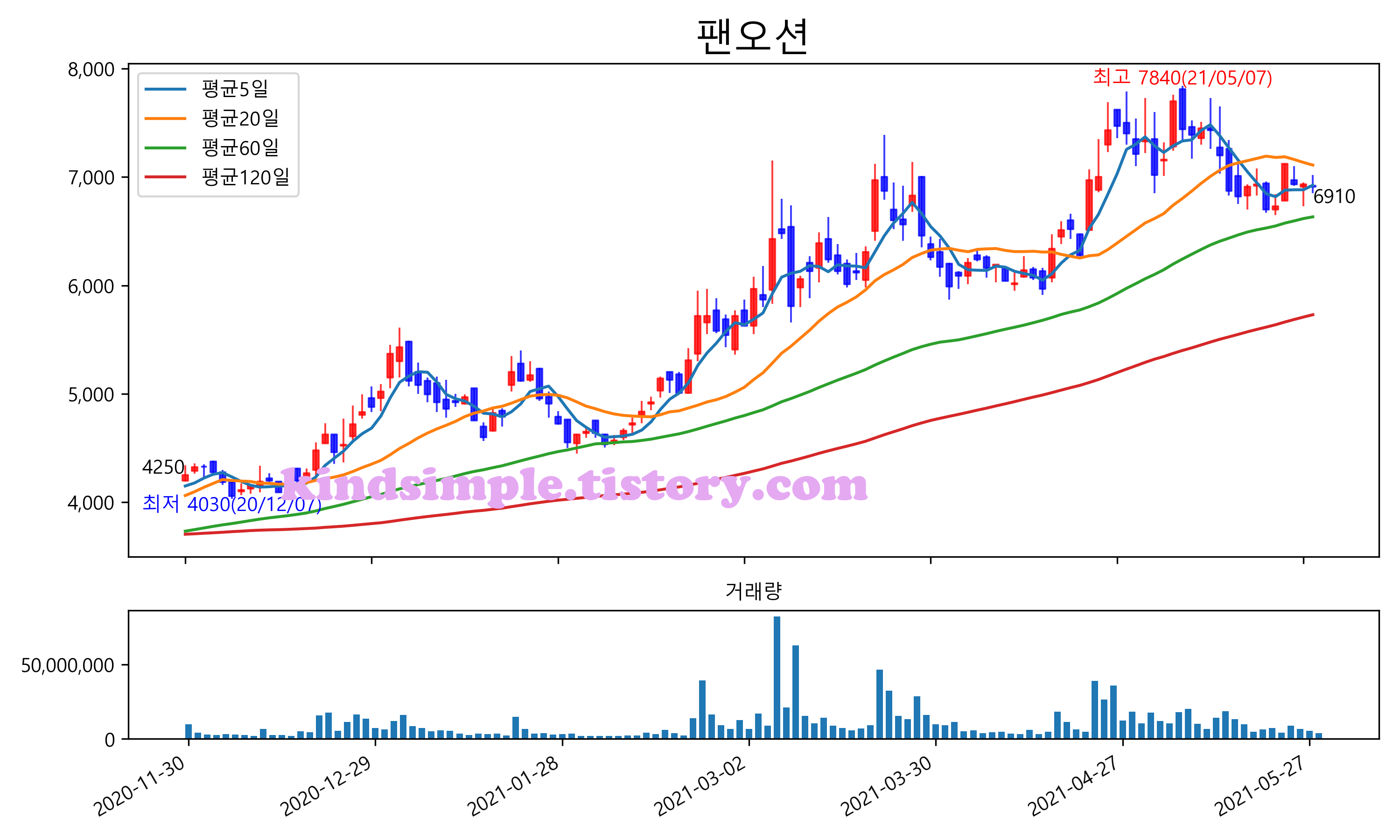 최근 6개월간 캔들차트 및 이동평균선입니다.