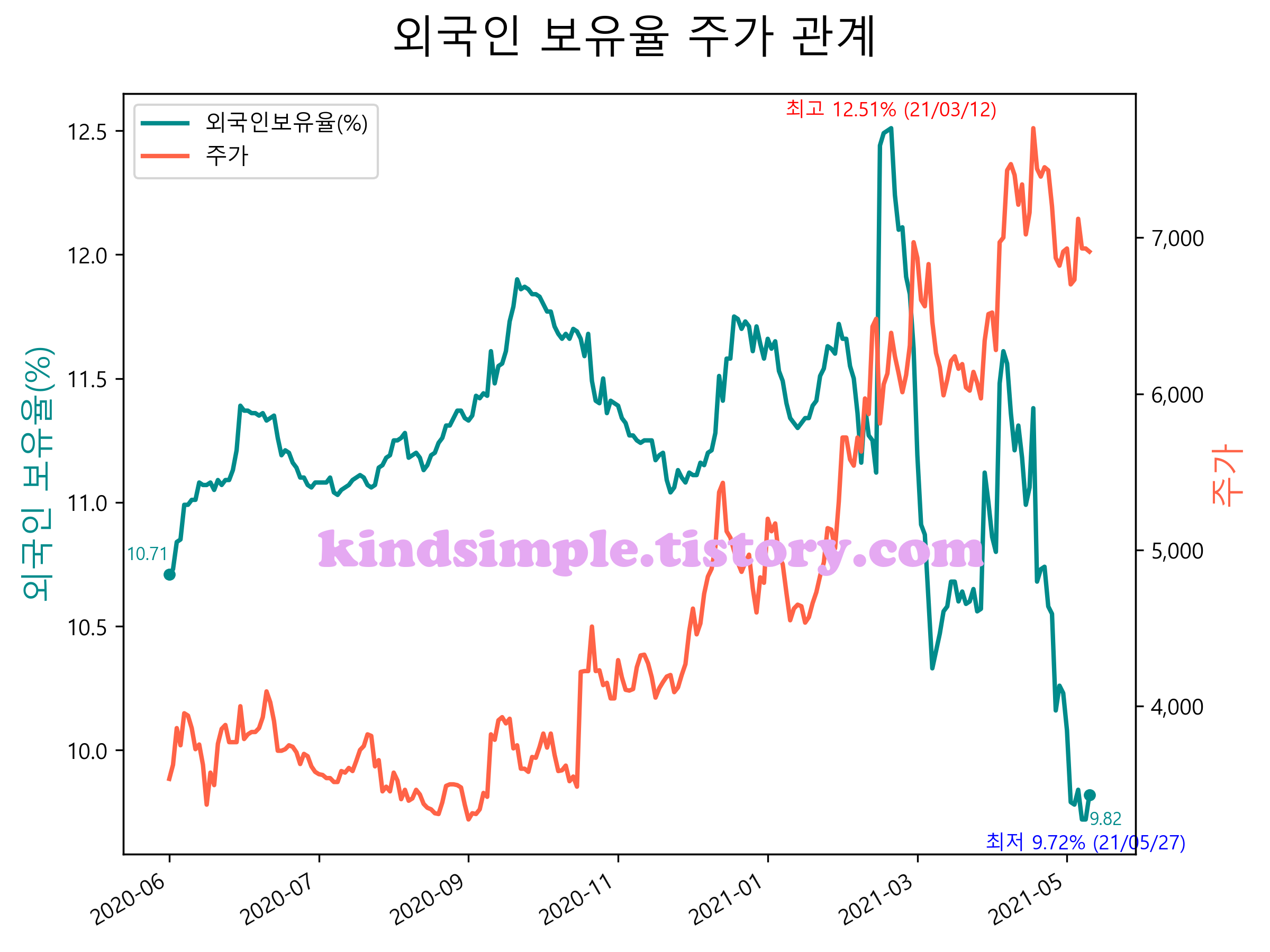 최근 1년간 외국인 보유율 및 주가와의 관계입니다.