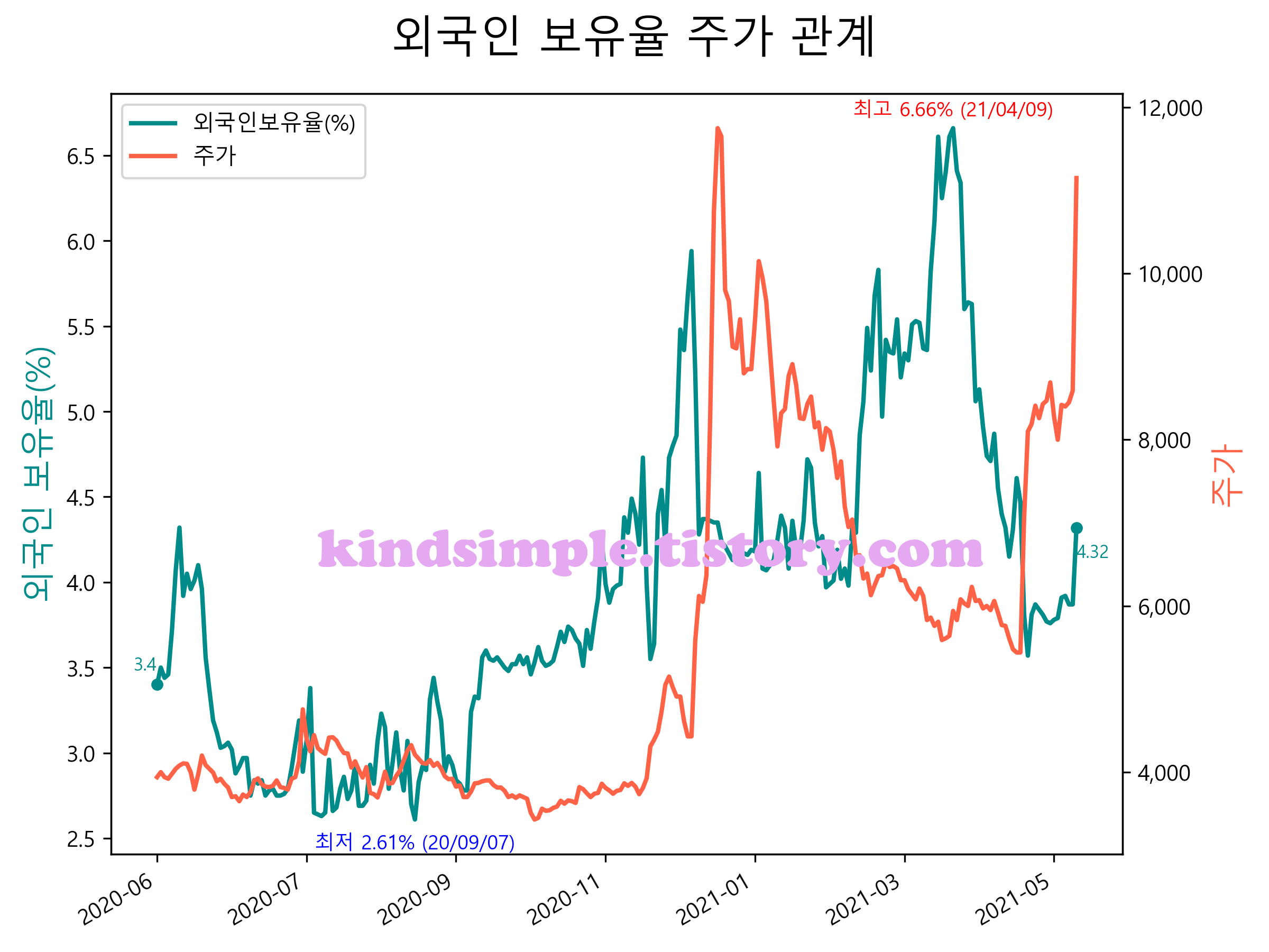 최근 1년간 외국인 보유율 및 주가와의 관계입니다.