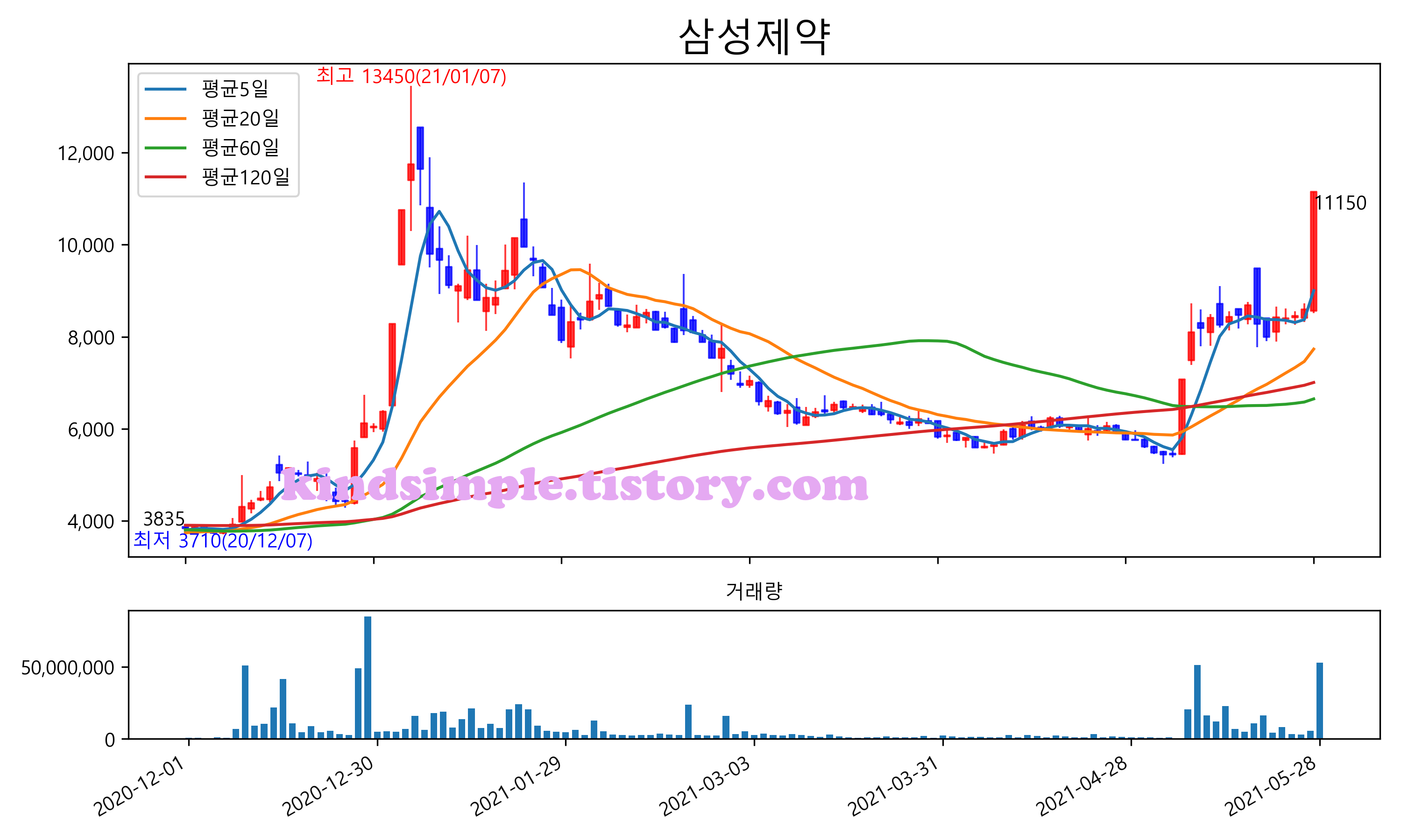 최근 6개월간 캔들차트 및 이동평균선입니다.