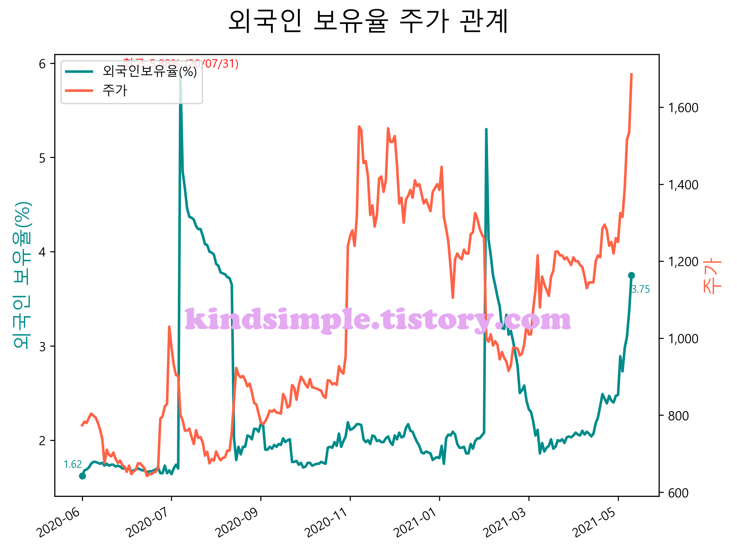 최근 1년간 외국인 보유율 및 주가와의 관계입니다.
