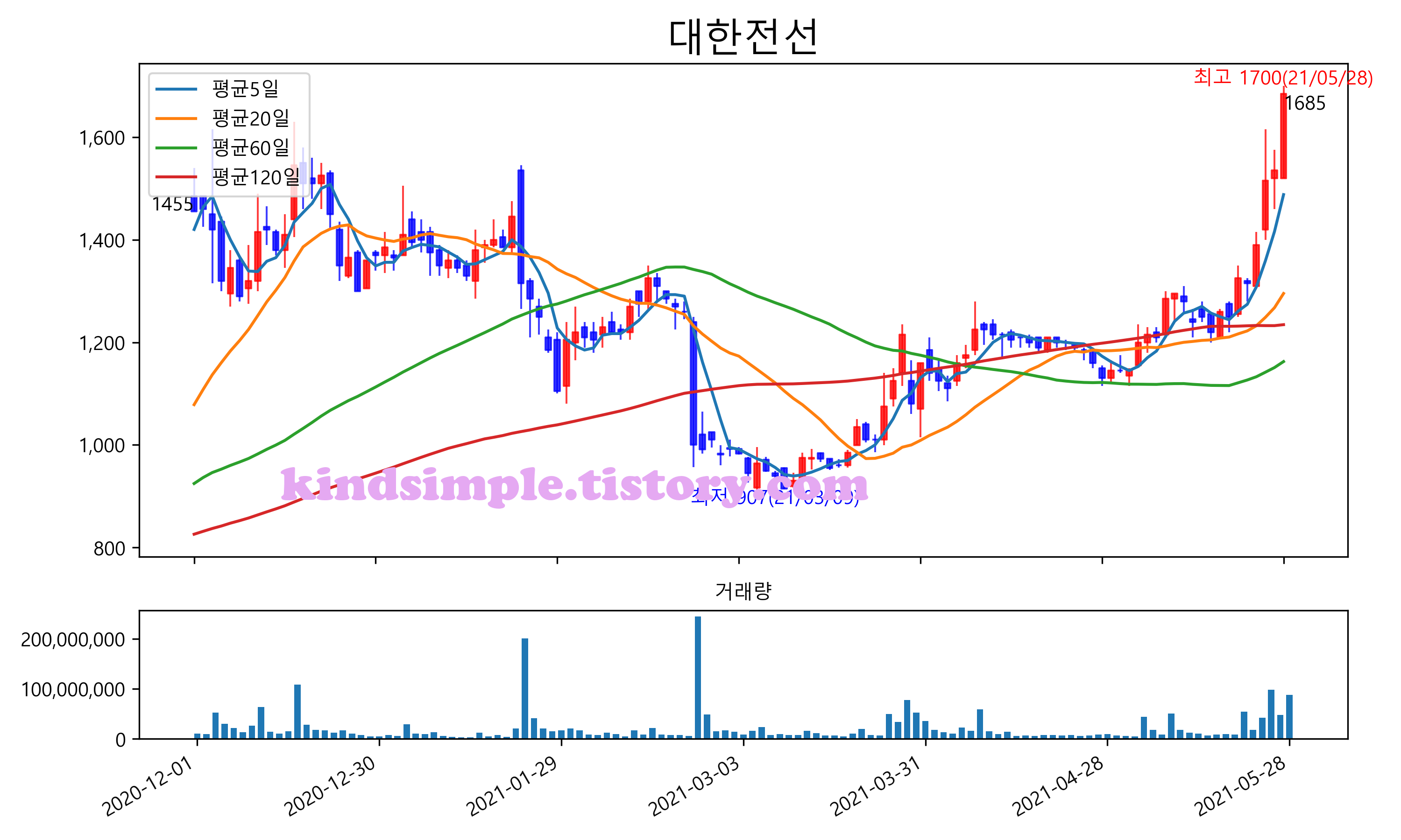 최근 6개월간 캔들차트 및 이동평균선입니다.