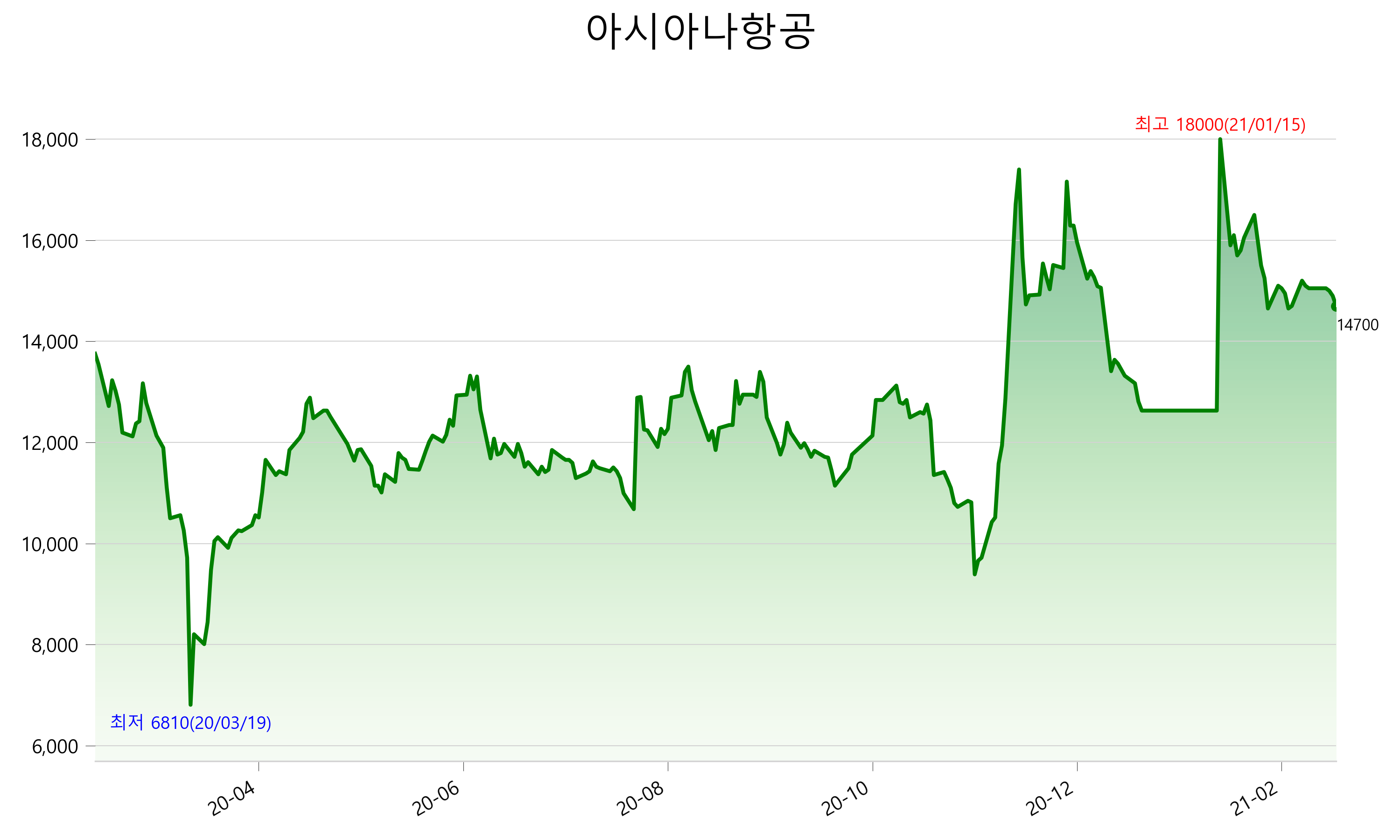 2021년 02월 18일 기준 주가는 14,700원 입니다. 아래는 최근 1년간의 주가흐름입니다.