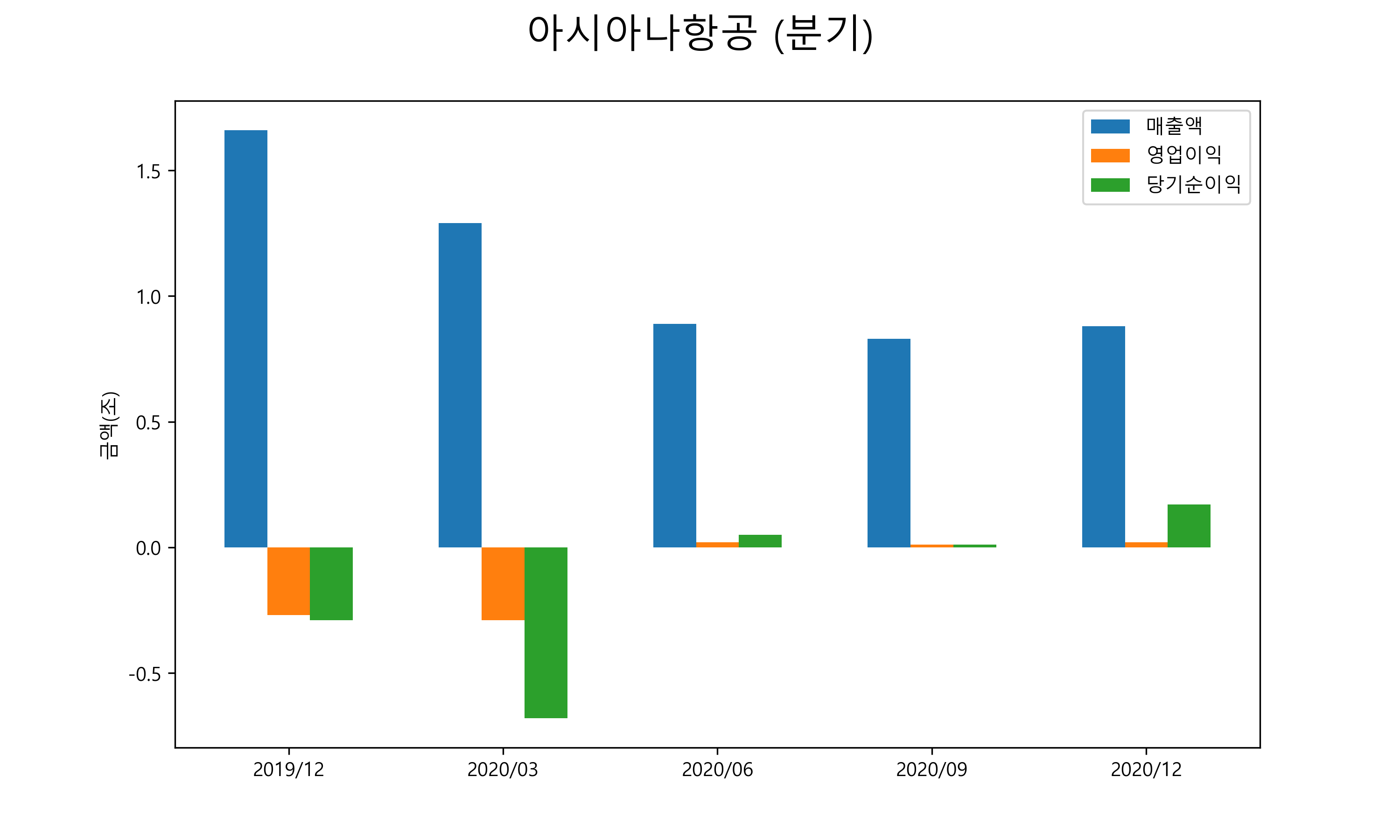 아시아나항공의 2020년 4분기 매출은 8808억원, 영업이익 170억원, 당기순이익 1658억원을 기록했습니다. 분기별 매출 및 영업이익, 당기순이익 표입니다.