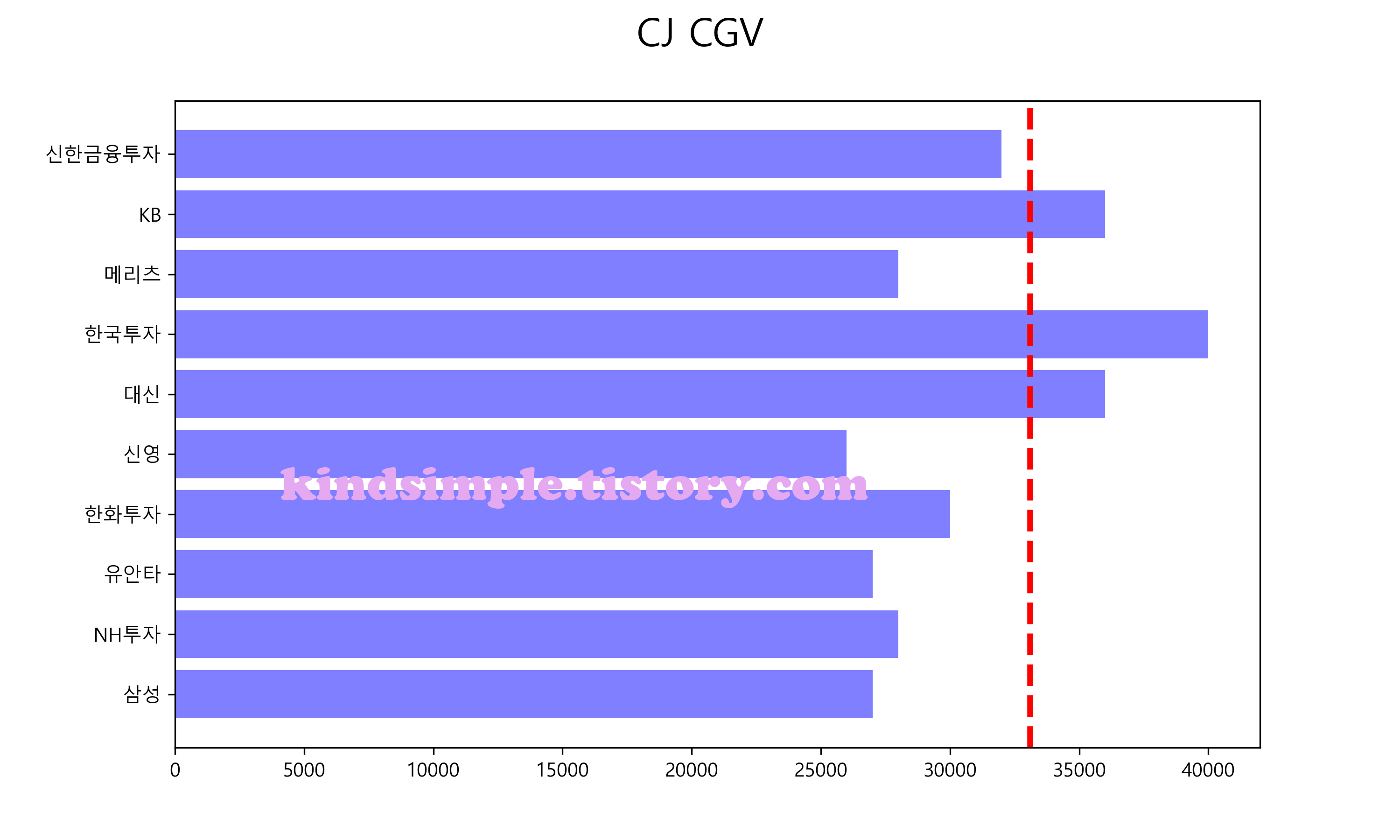 현재 주가보다 상승할 것이라고 예측한 증권사은 3곳이며 하락할 것이라고 예측한 증권사는 7곳 입니다. CJ CGV의 6월 2일 기준 현재 주가로 33,100원 입니다. 목표주가 평균추정치는 31,000원 으로 현재 주가 대비 -6.3% 낮습니다.