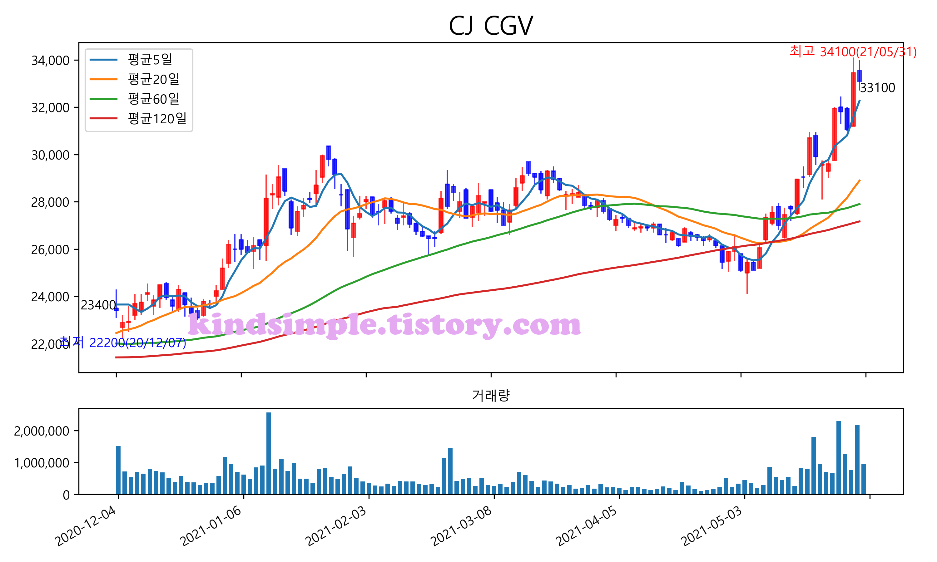최근 6개월간 캔들차트 및 이동평균선입니다.