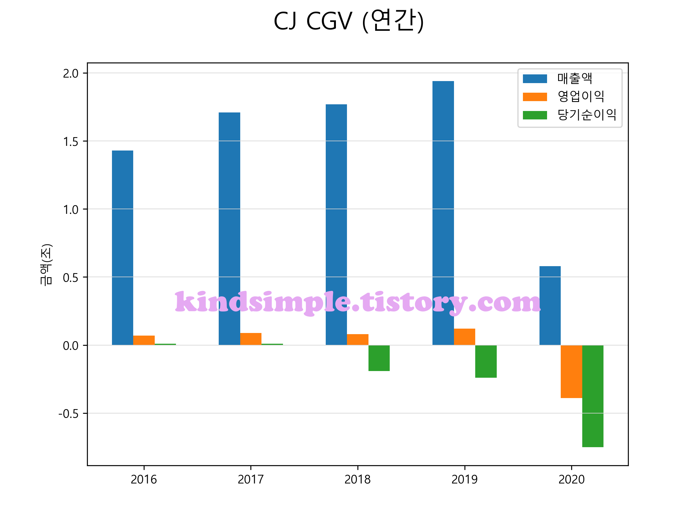 CJ CGV의 최근 5년간 실적입니다. 2020년 매출은 5834억원, 영업손실 -3887억원, 당기순손실 -7516억원을 기록했습니다. 연간 매출 및 영업이익, 당기순이익 표입니다.