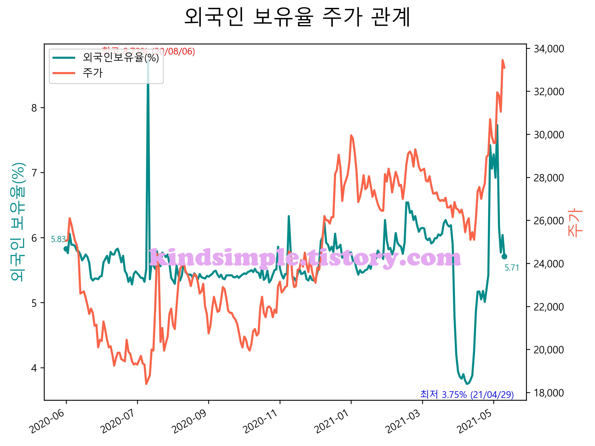 최근 1년간 외국인 보유율 및 주가와의 관계입니다.