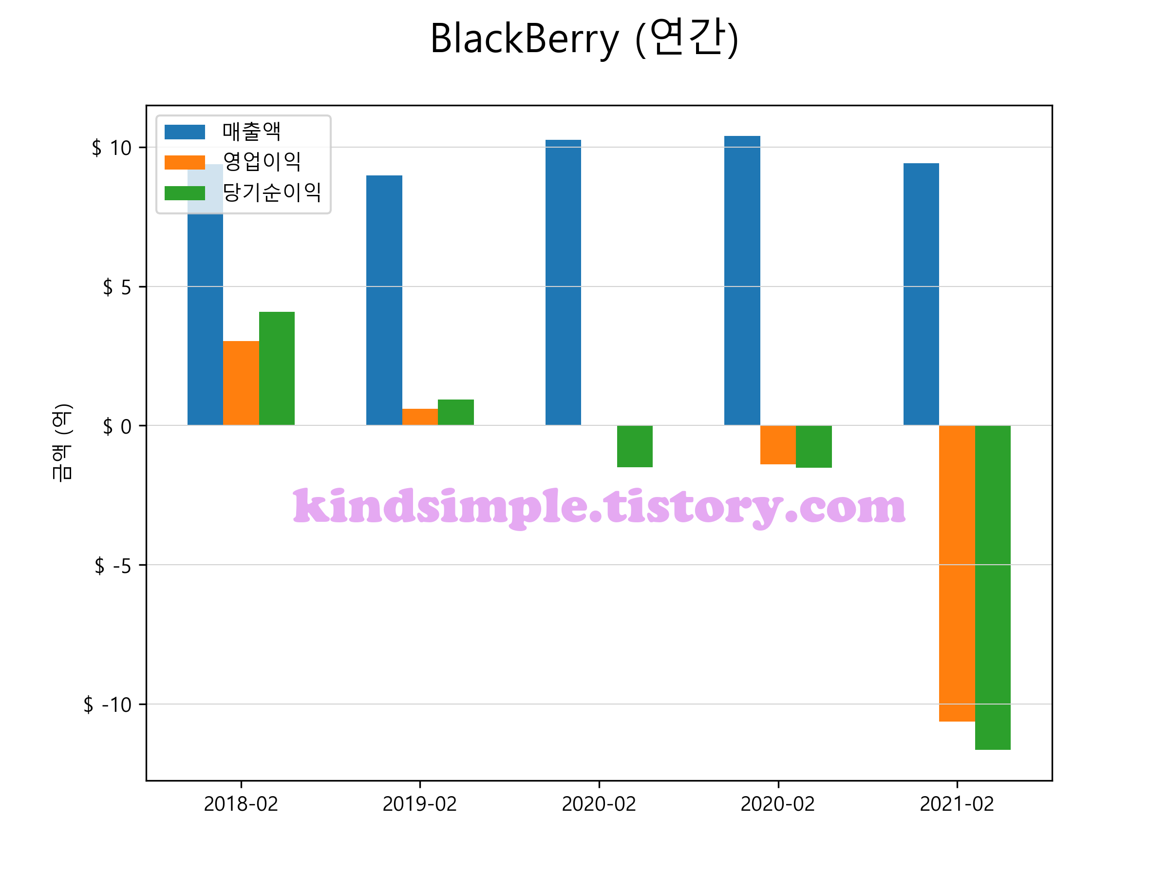 블랙베리는 2021년 2월 기준으로 실적을 발표합니다. 2021년 매출은 9.42억달러(약 1조 0456억원), 영업손실 -10.64억달러(약 -1조 1810억원), 당기순손실 -11.65억달러(약 -1조 2932억원)을 기록했습니다. 연간별 매출 및 영업이익, 당기순이익 표입니다.