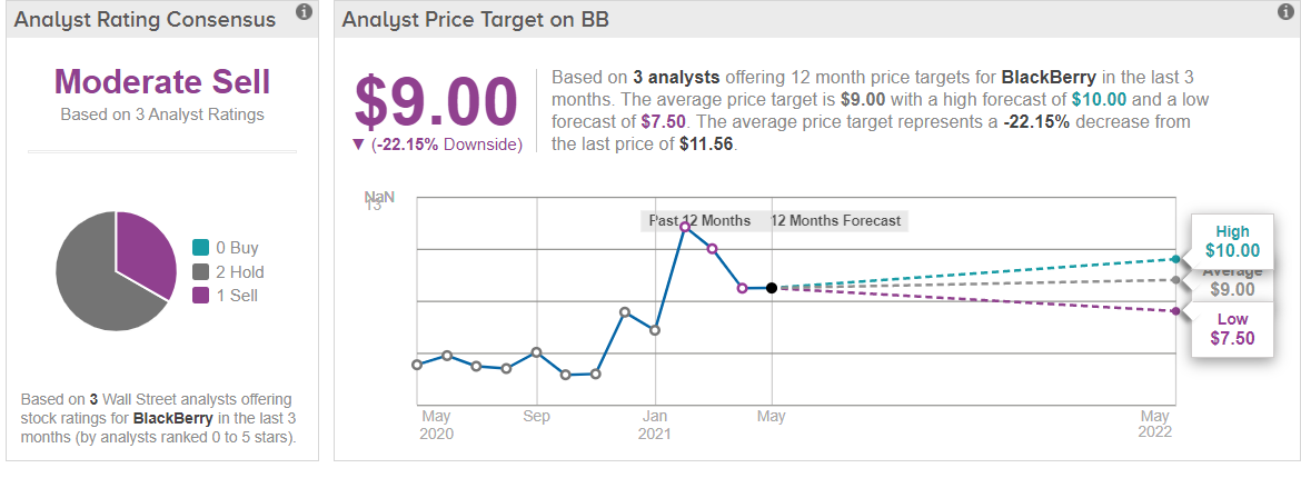 팁랭크스(Tipranks)에서 블랙베리의 투자의견입니다. 지난 3개월 동안 총 3명의 애널리스트가 목표가를 추정하였습니다. 목표주가는 $9.00로 현재주가 $11.56보다 -22.15% 하락할 것으로 전망했습니다. 가장 높은 목표주가는 $10.00이며, 가장 낮은 목표주가는 $7.50입니다.