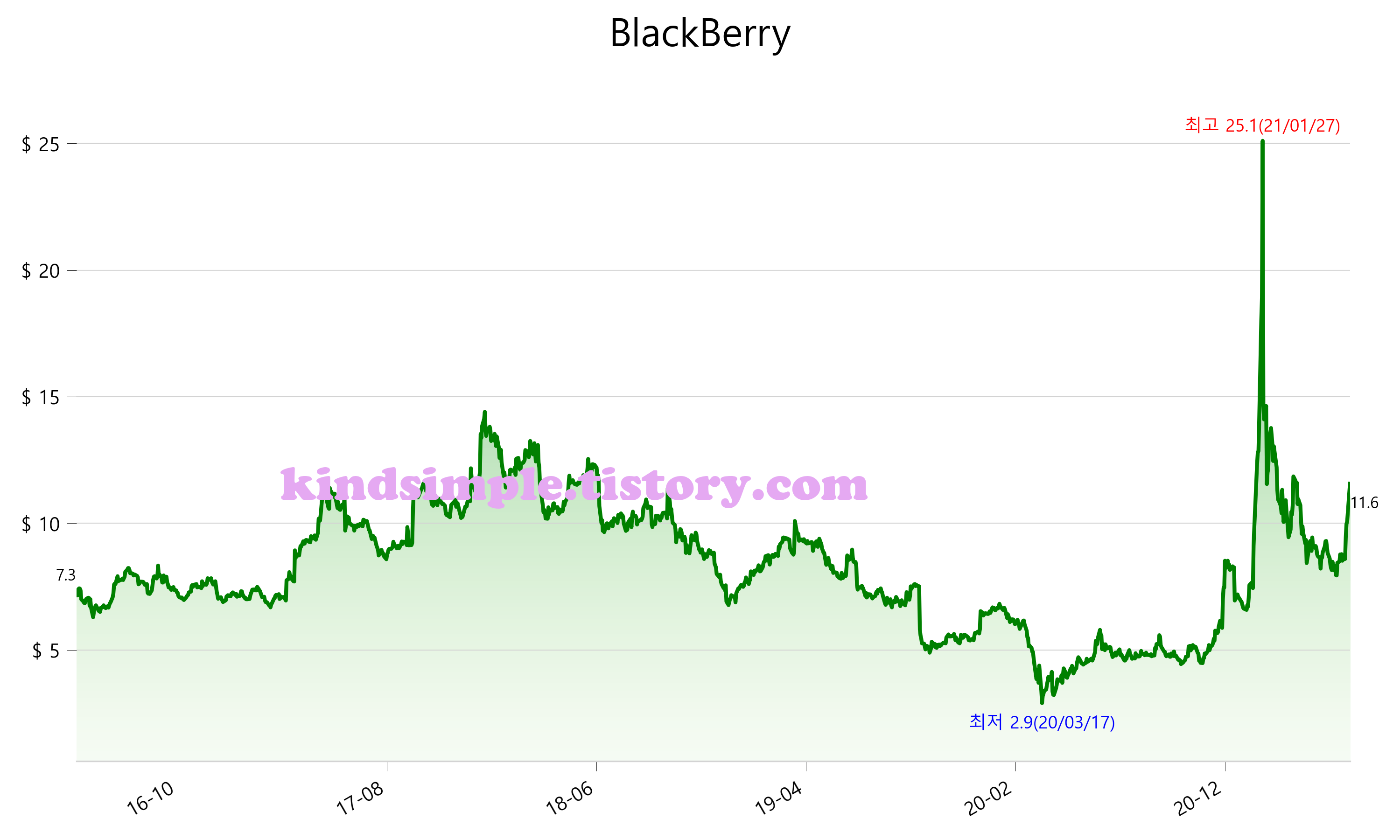 블랙베리는 21년 초 게임스탑, AMC 등과 함께 개미들이 공매도 세력에 맞서 주식을 사들여서 주가가 급등했습니다. 온라인 커뮤니티 레딧의 월스트리트베츠그룹 개인 투자자들의 매수세가 주가 상승을 견인한 것입니다.