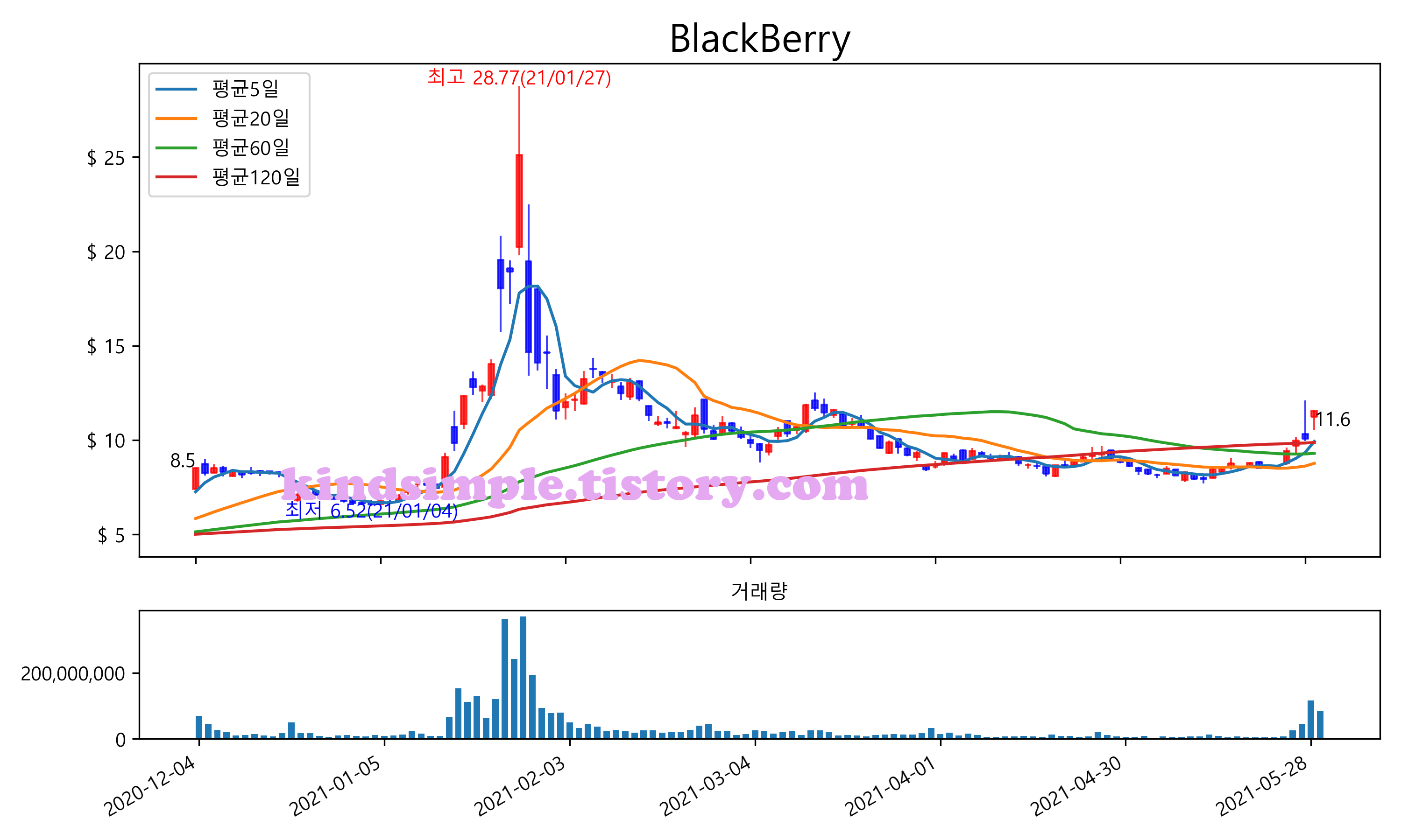 이후에는 다소 하락하여 원래대로 회복되었다가 다시 주가가 상승하고 있습니다. '밈(Meme·온라인에서 유행하는 사진이나 영상) 주식’에 대한 개인투자자들의 투자 열풍에 블랙베리 주가가 연일 강세를 나타내고 있는 것입니다.