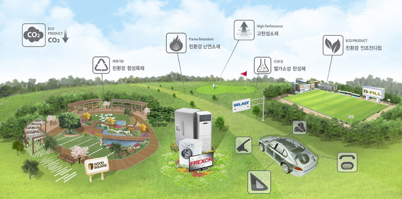 - 고분자 신소재 개발기술을 바탕으로 자동차 내장재용, 건축용 및 레저용 등 다양한 고부가 신소재를 제조하여 판매하고 있으며, 고부가 신소재를 활용한 건축용 외장재를 제조하여 판매하고 있음.