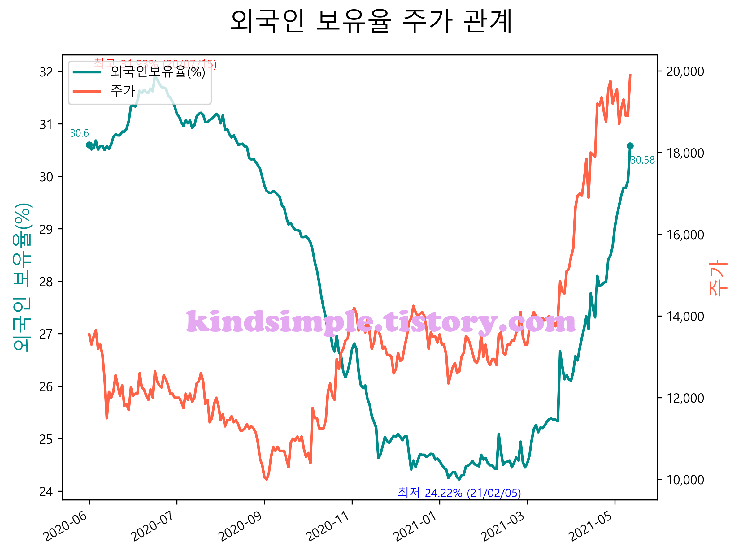 최근 1년간 외국인 보유율 및 주가와의 관계입니다.