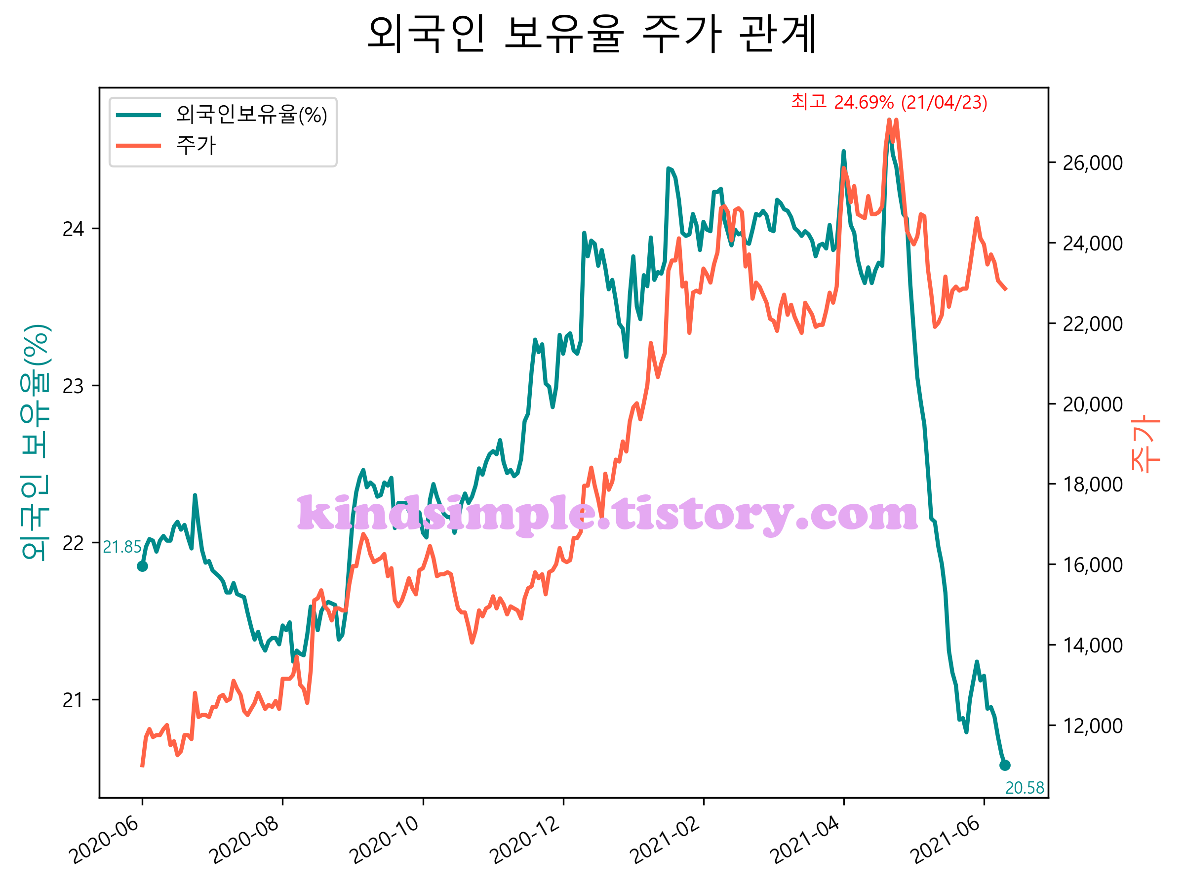 최근 1년간 외국인 보유율 및 주가와의 관계입니다.
