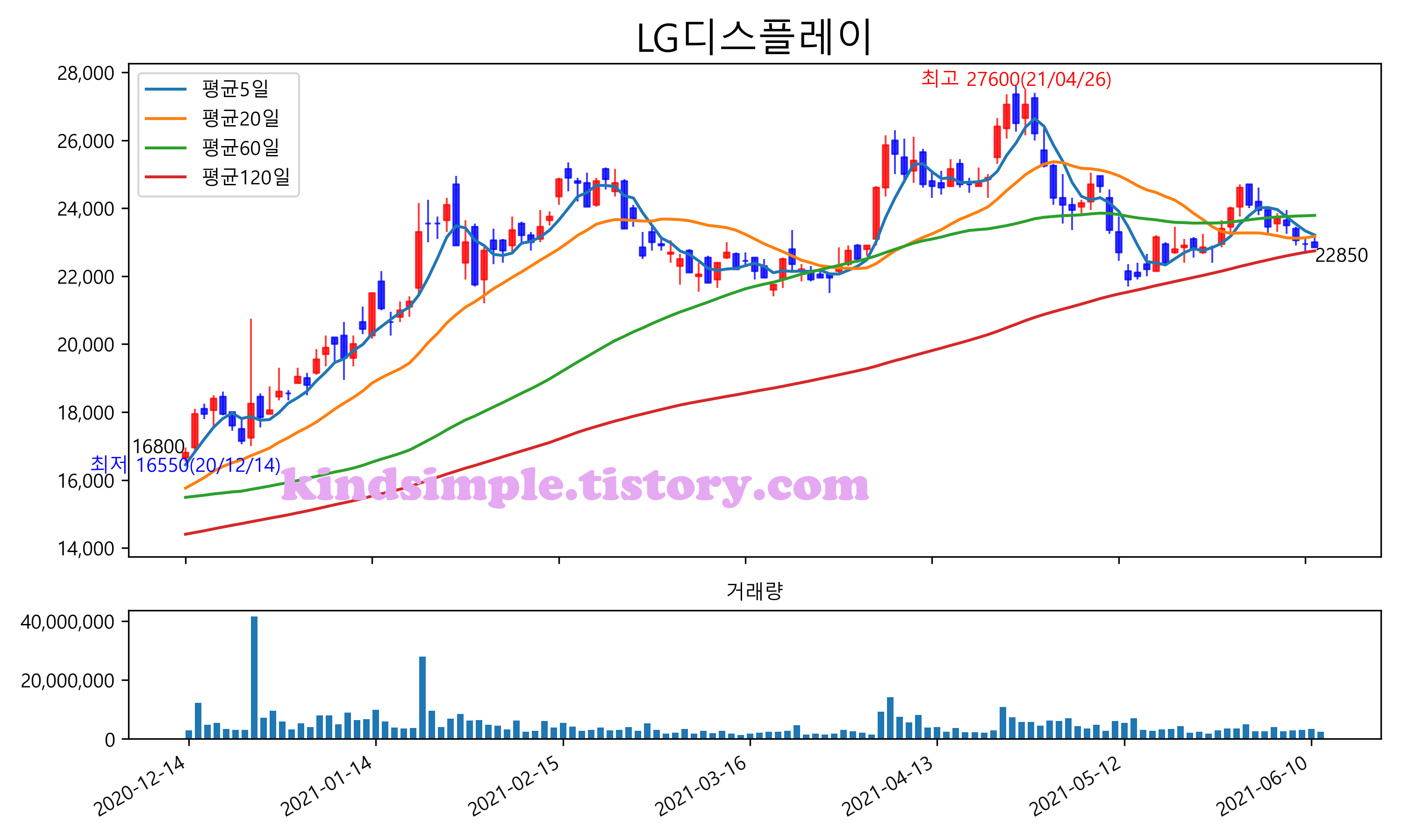 최근 6개월간 캔들차트 및 이동평균선입니다.