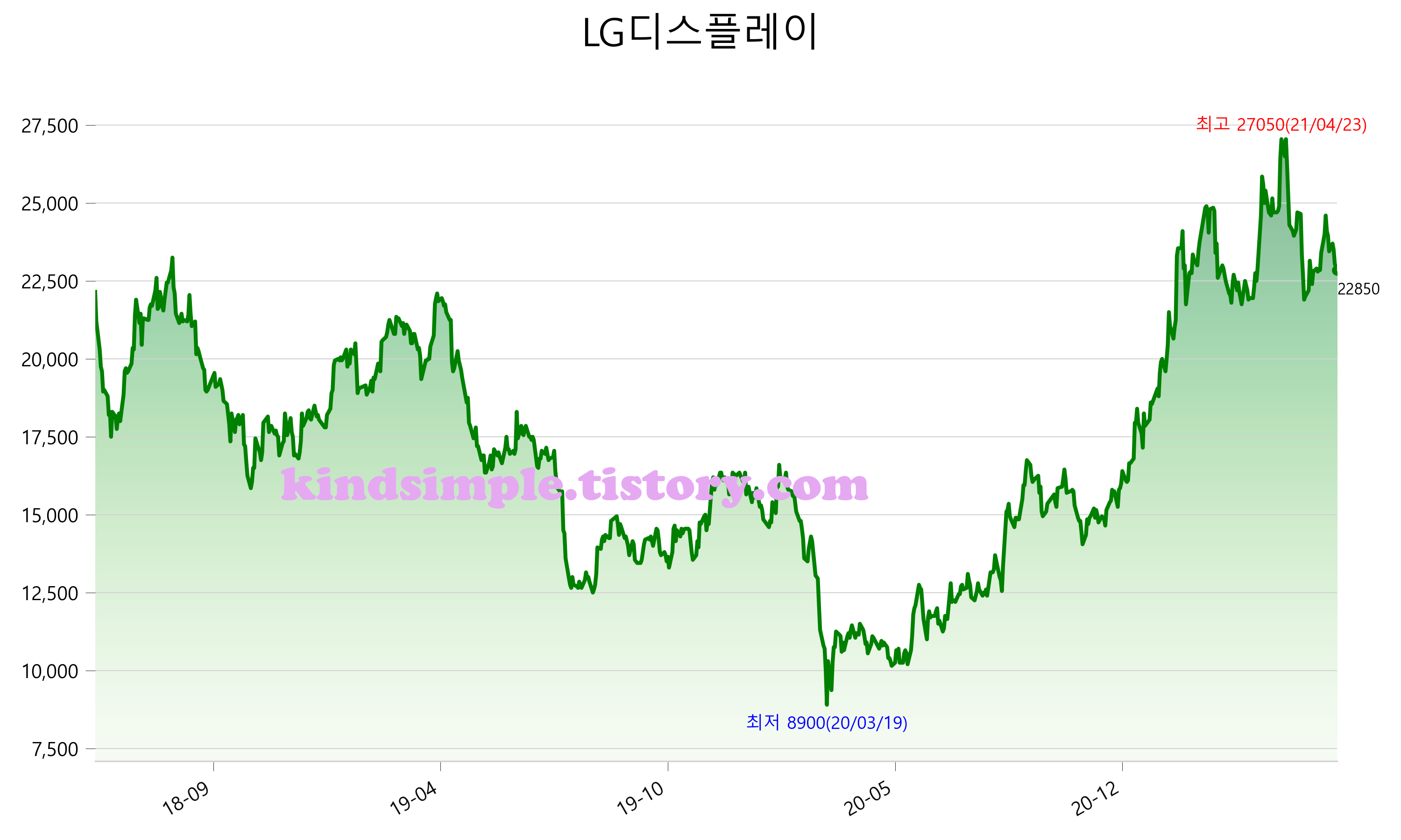 6월 12일 기준 주가는 22,850원 입니다. 아래는 최근 3년간의 주가흐름입니다.