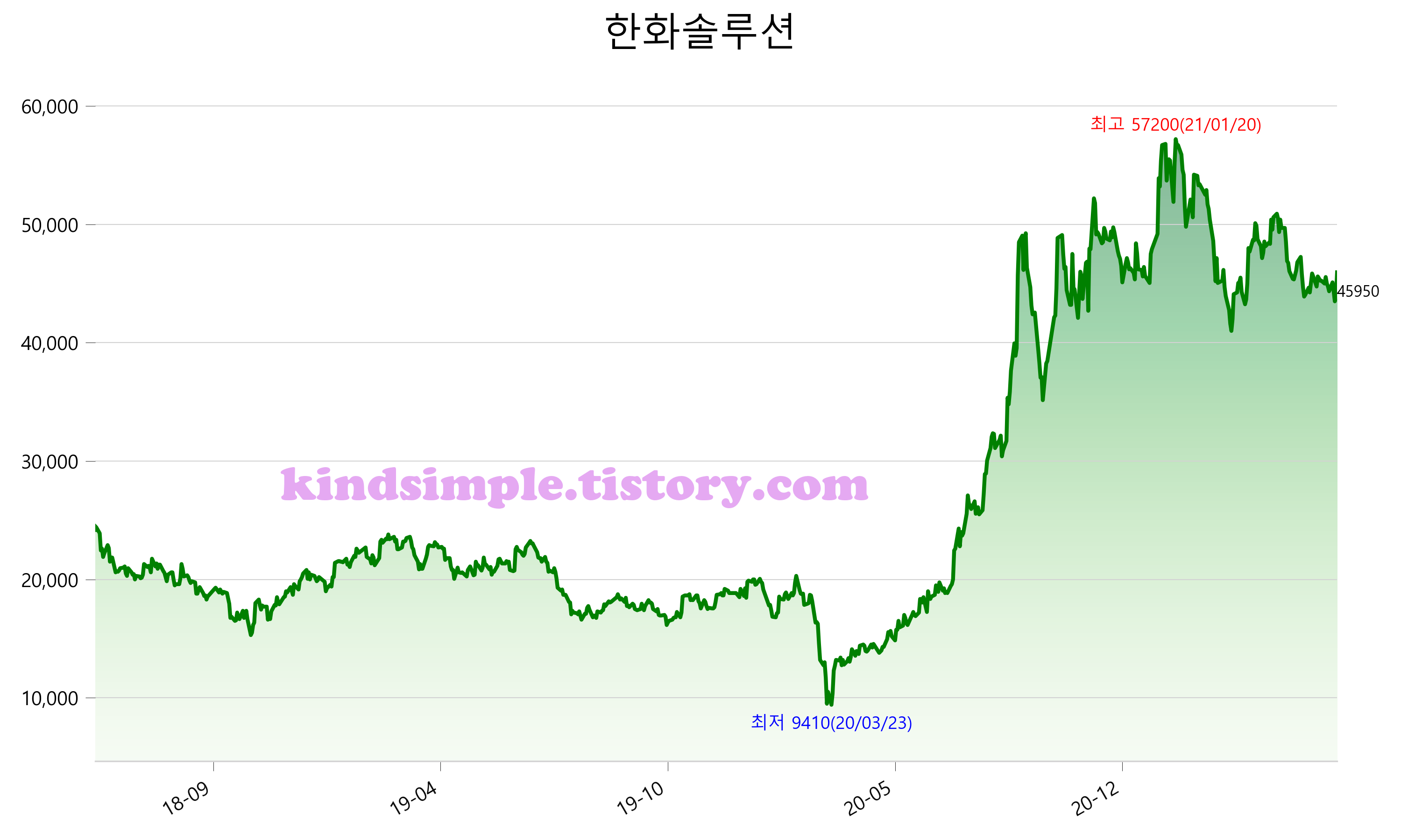 6월 12일 기준 주가는 45,950원 입니다. 아래는 최근 3년간의 주가흐름입니다.