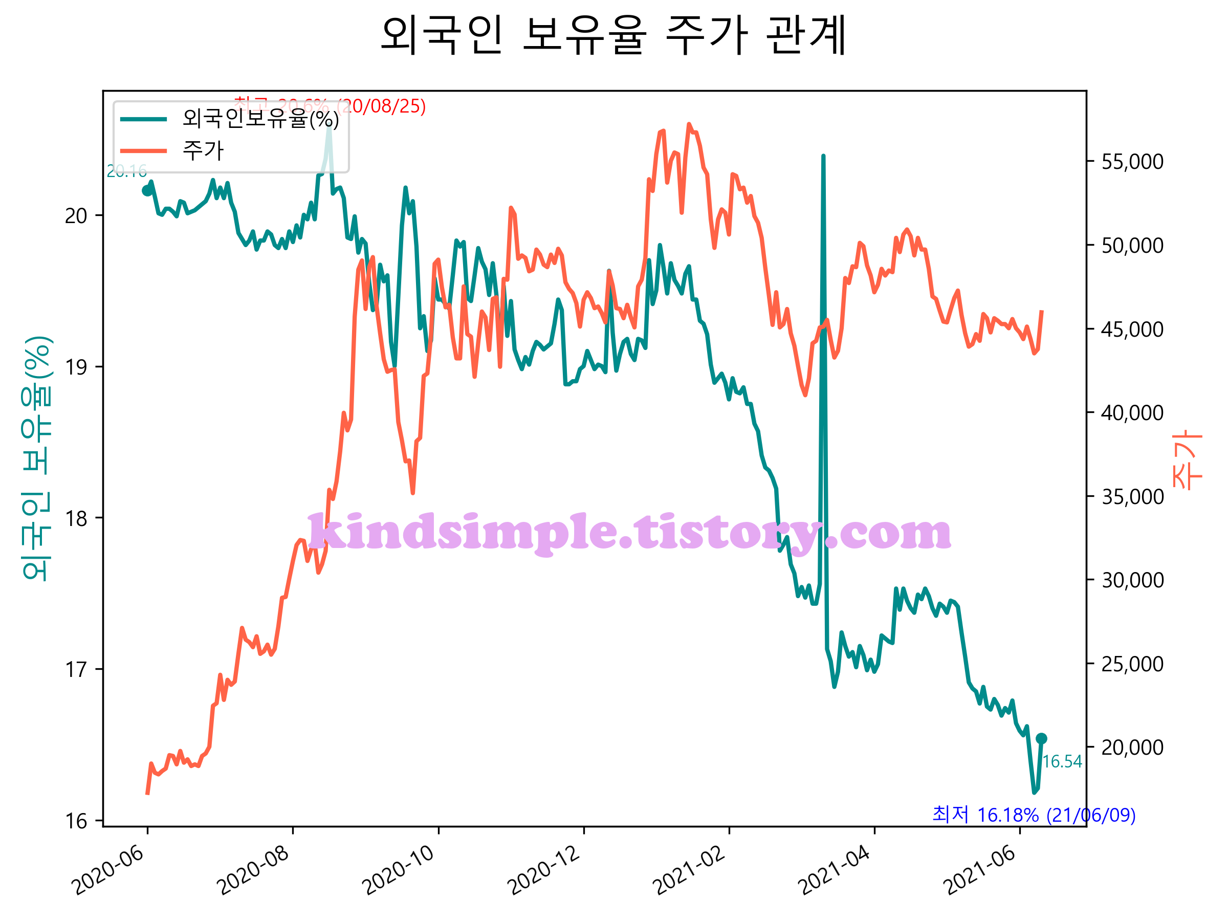 최근 1년간 외국인 보유율 및 주가와의 관계입니다.