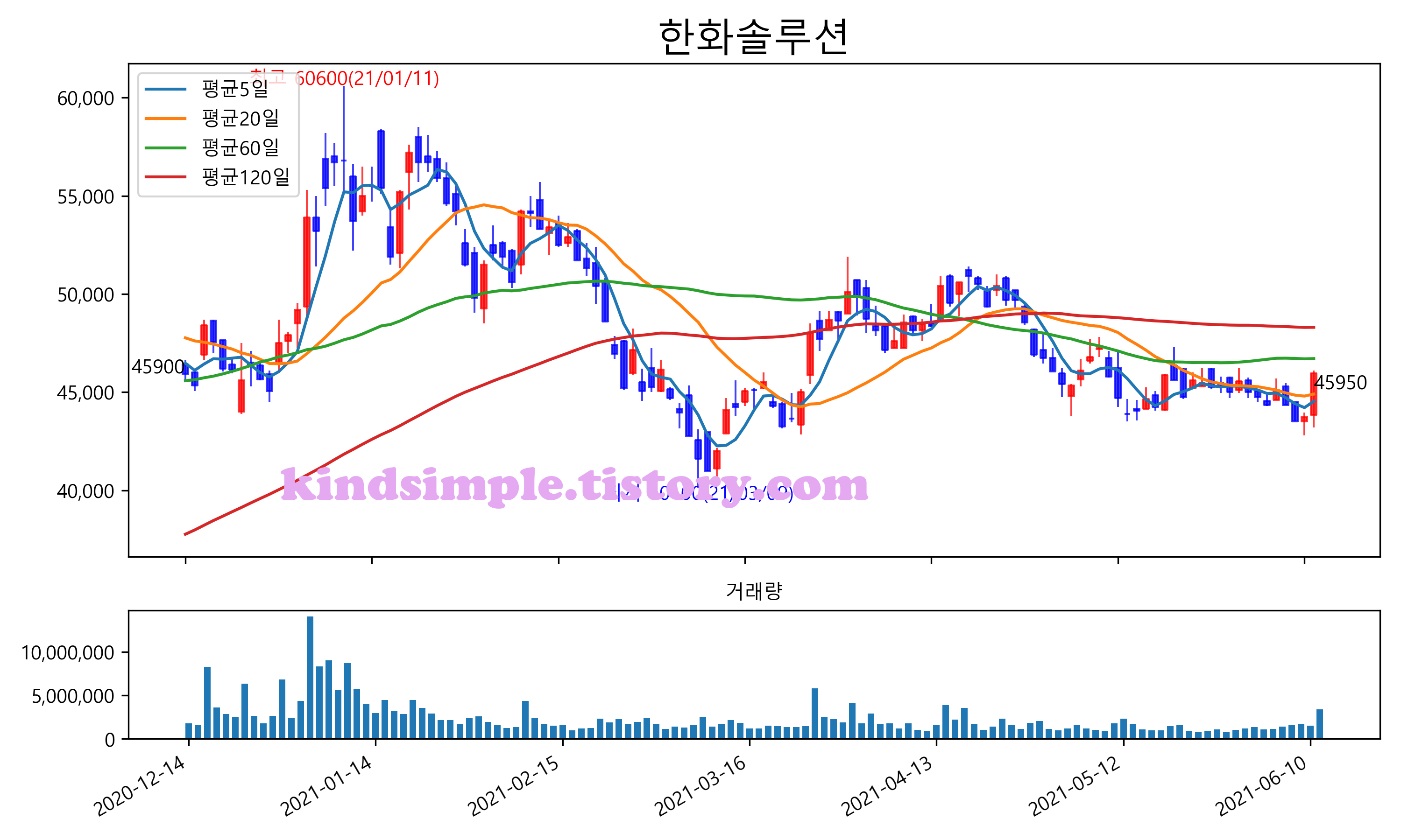 최근 6개월간 캔들차트 및 이동평균선입니다.