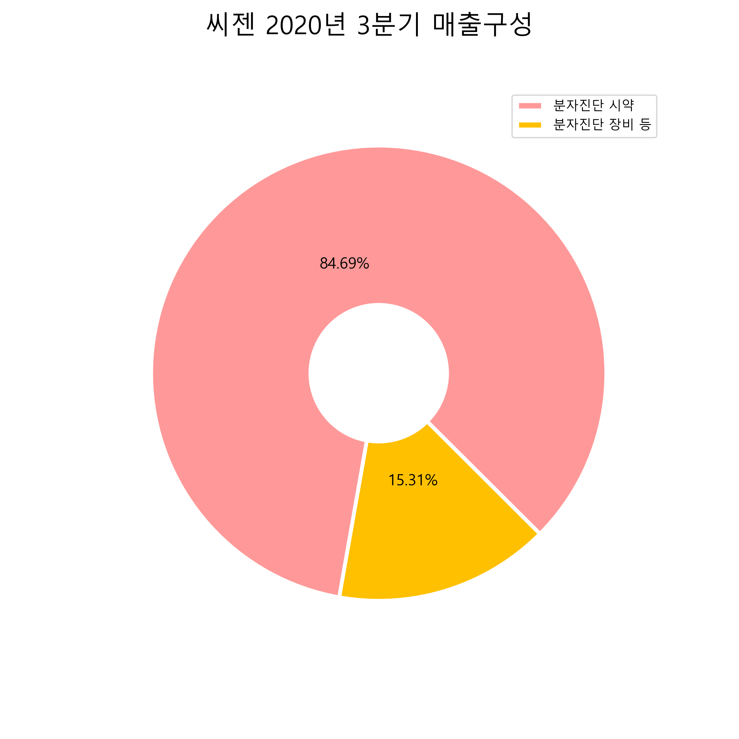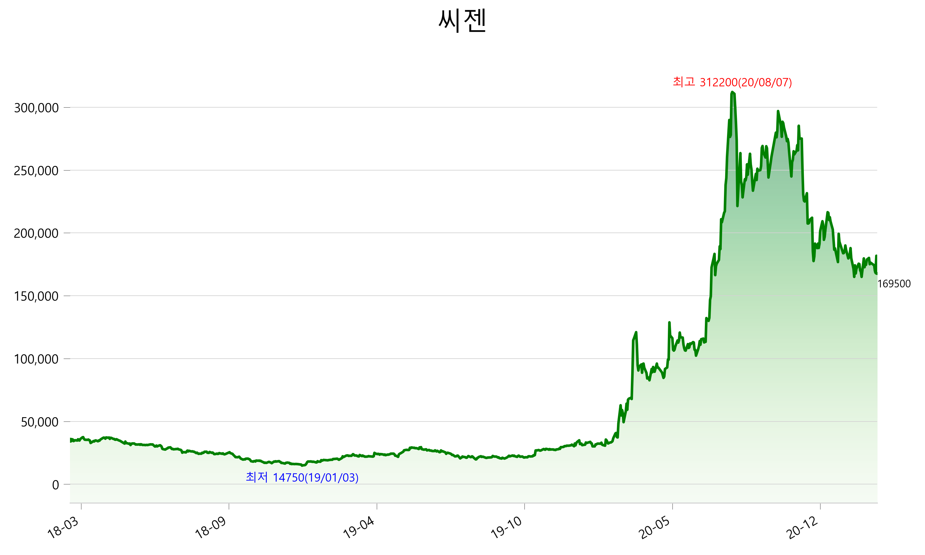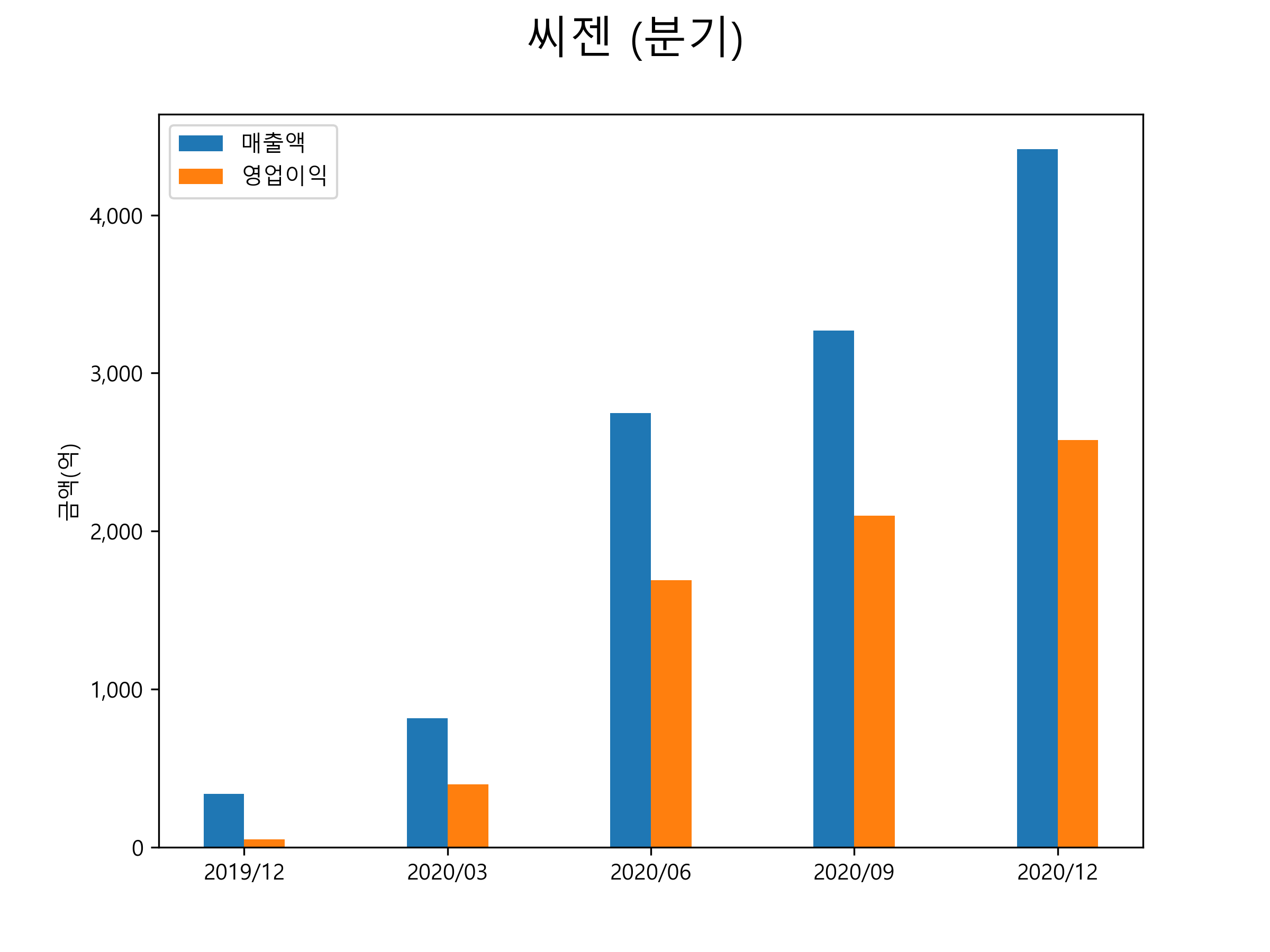 씨젠은 코로나19 진단키트를 세계 60여개국에 수출하면서 매출 및 영업이익이 큰폭으로 상승하였습니다. 이에 주가도 큰폭으로 상승하였습니다. 매출이 1년 새 약 10배에 가깝게 상승했습니다.