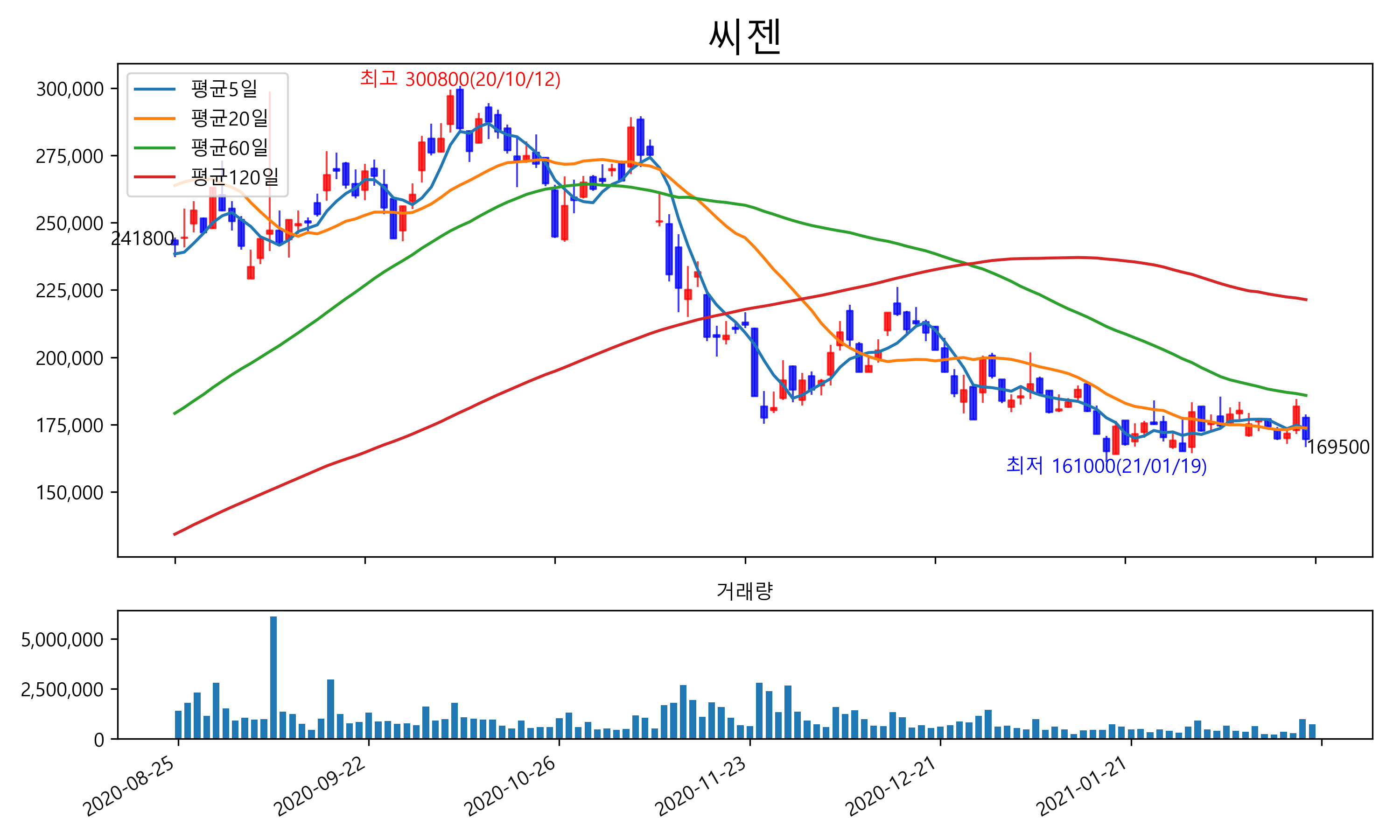 최근 6개월간 캔들차트 및 이동평균선입니다.