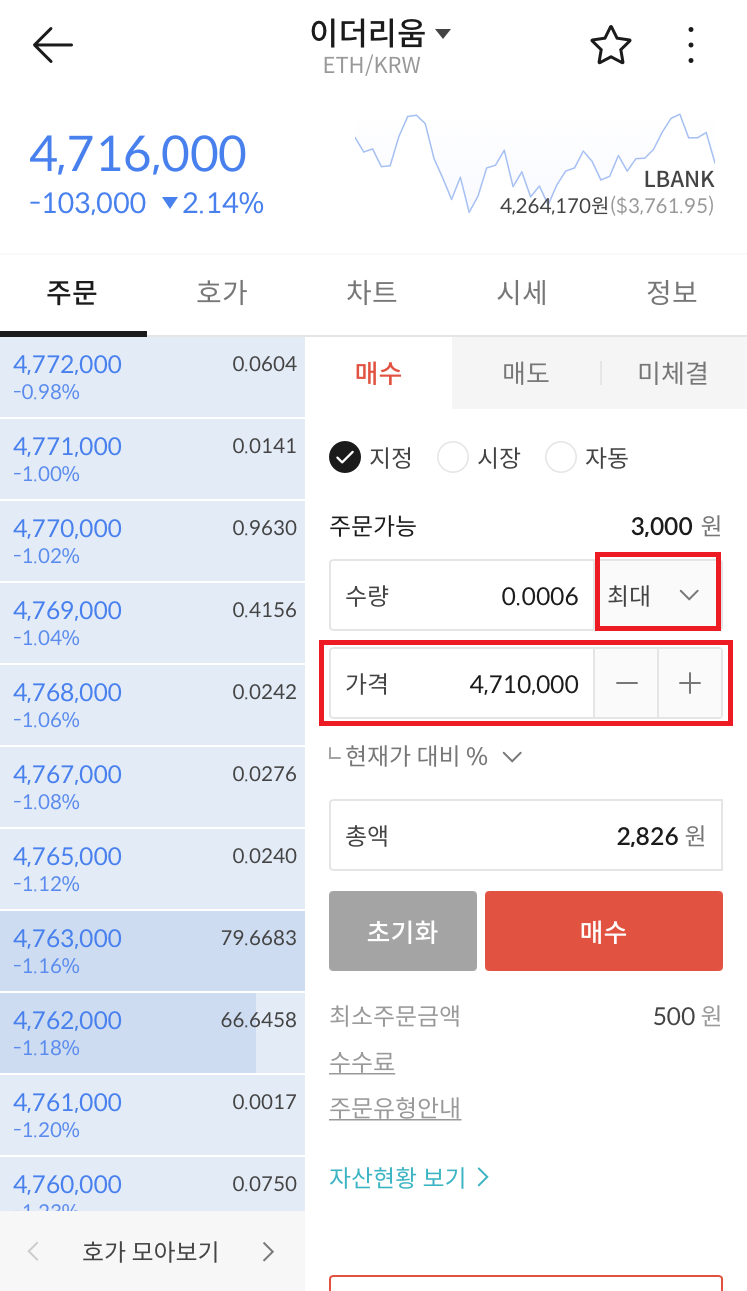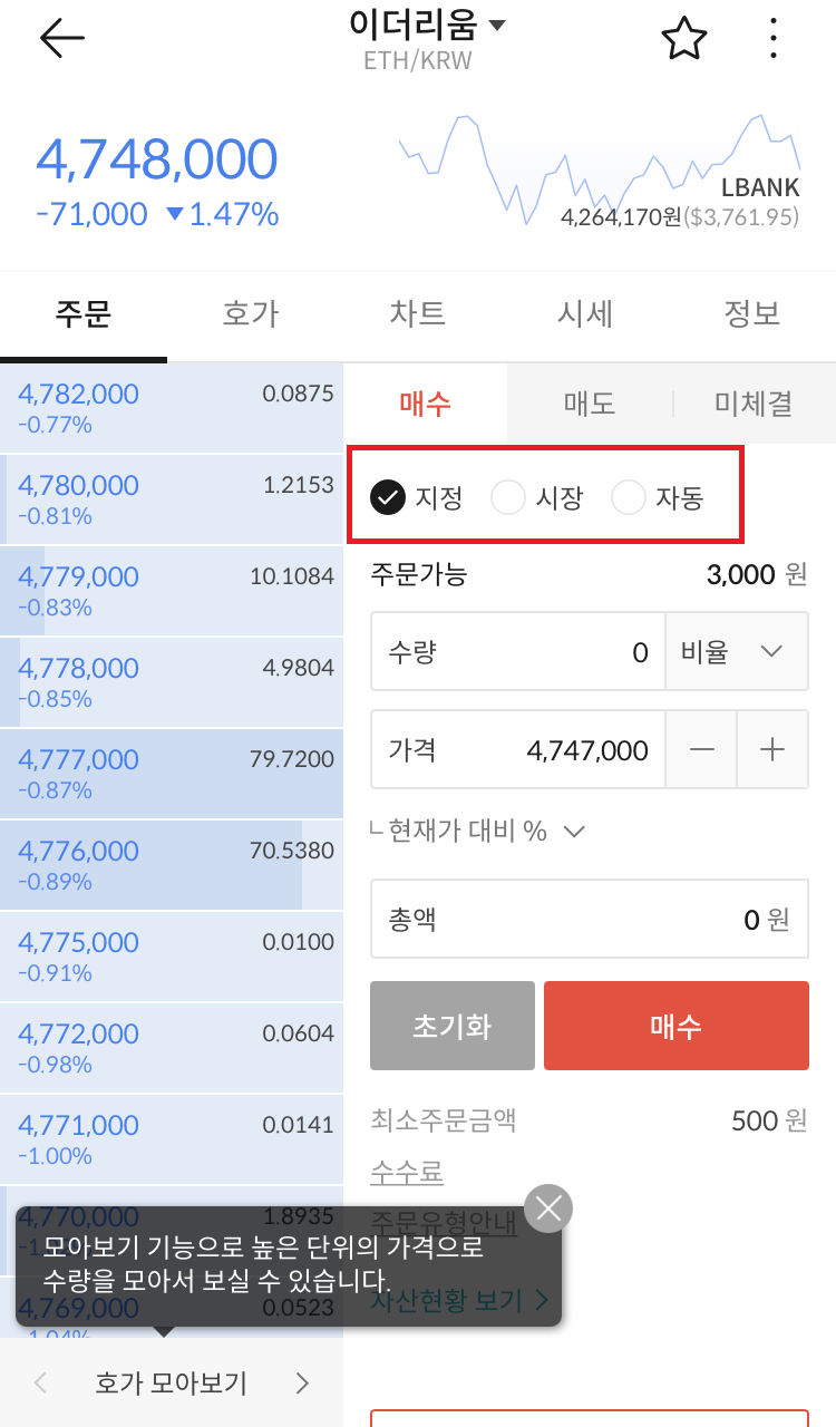 지정은 금액을 지정해서 살 수 있고, 시장은 시장가로 바로 살 수 있습니다.