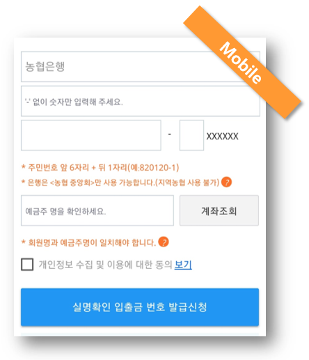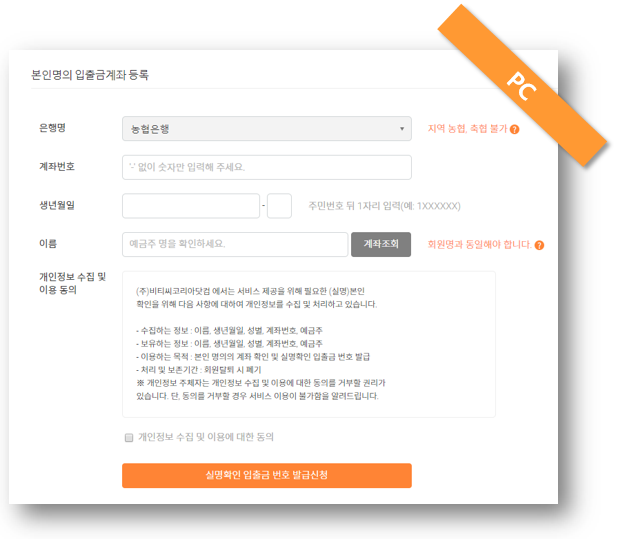빗썸은 투명한 거래를 위해 실명확인 입출금번호를 발급하고 있습니다. 실명확인 입출금번호를 발급받기 위해서는 농협 계좌를 등록해야 합니다. 농협중앙회 계좌는 1인 1계좌로 발급하고 있으며, 외국인 또는 법인(기업)회원의 경우 실명확인 입출금번호 발급이 불가능합니다.