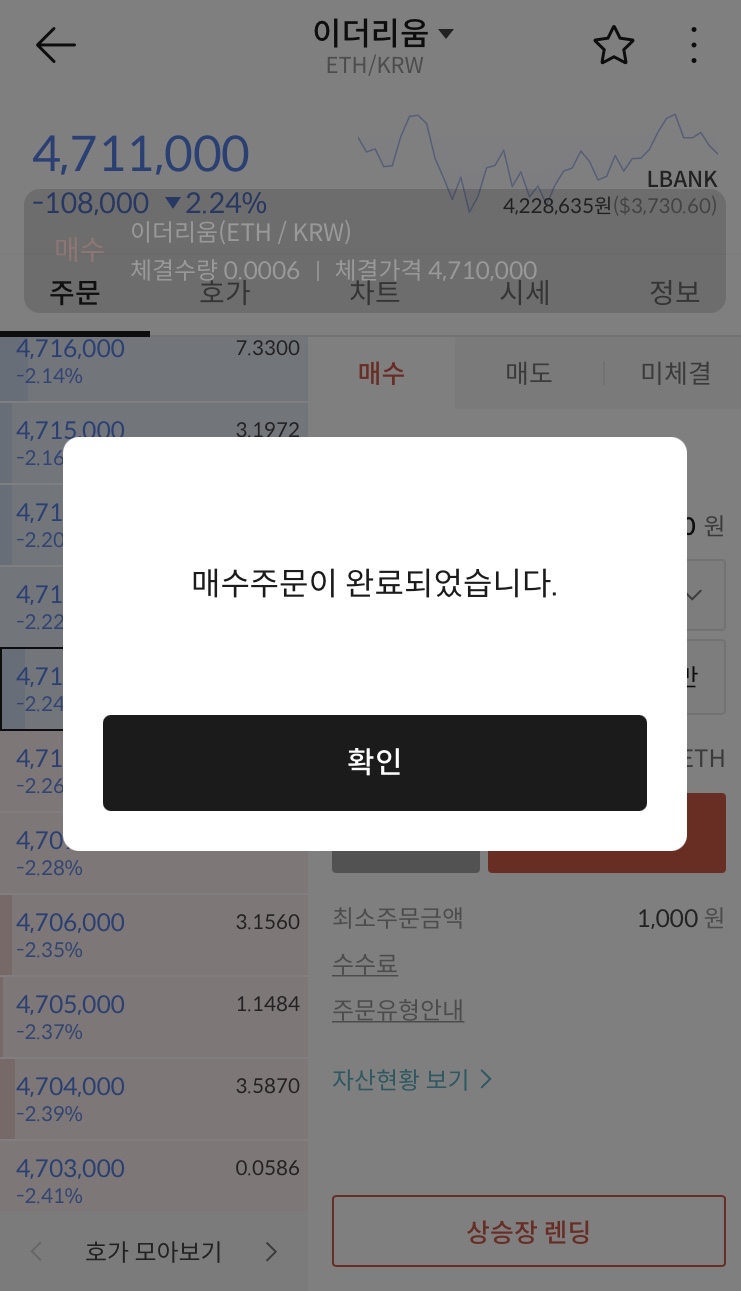 마지막 단계로 매수버튼을 누르면 됩니다. 자산현황을 보면 투자 코인 및 수익률에 대해서 알 수 있습니다.
