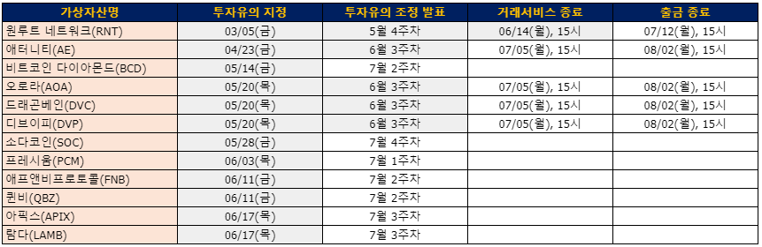 빗썸의 투자유의종목 및 거래서비스가 종료되는 코인입니다. 아래 코인에 대해서는 투자에 유의가 필요합니다.