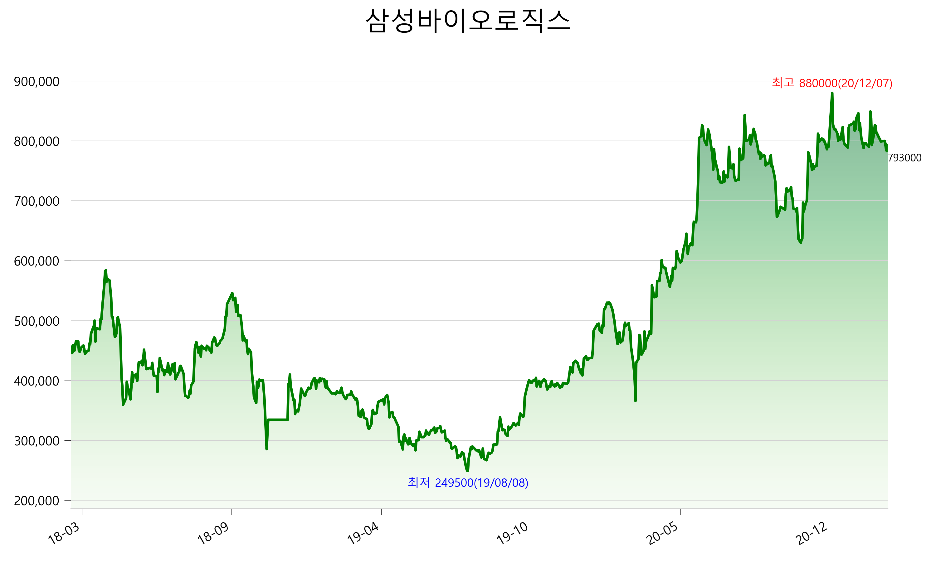 2021년 02월 21일 기준 주가는 793,000원 입니다. 아래는 최근 3년간의 주가흐름입니다.