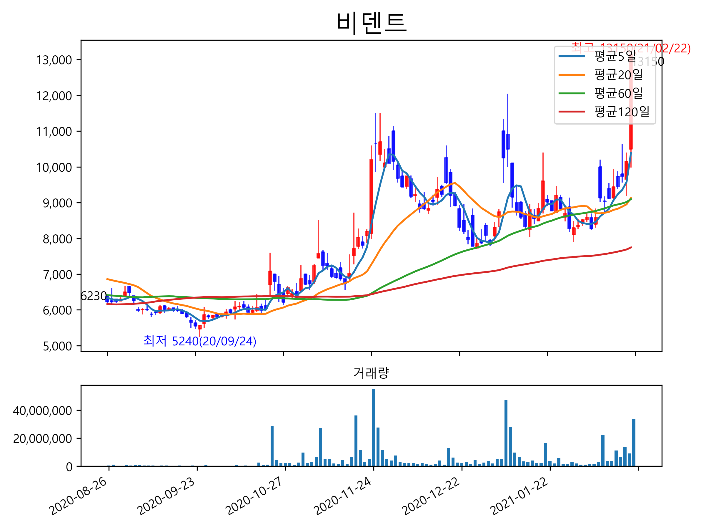 최근 6개월간 캔들차트 및 이동평균선입니다.