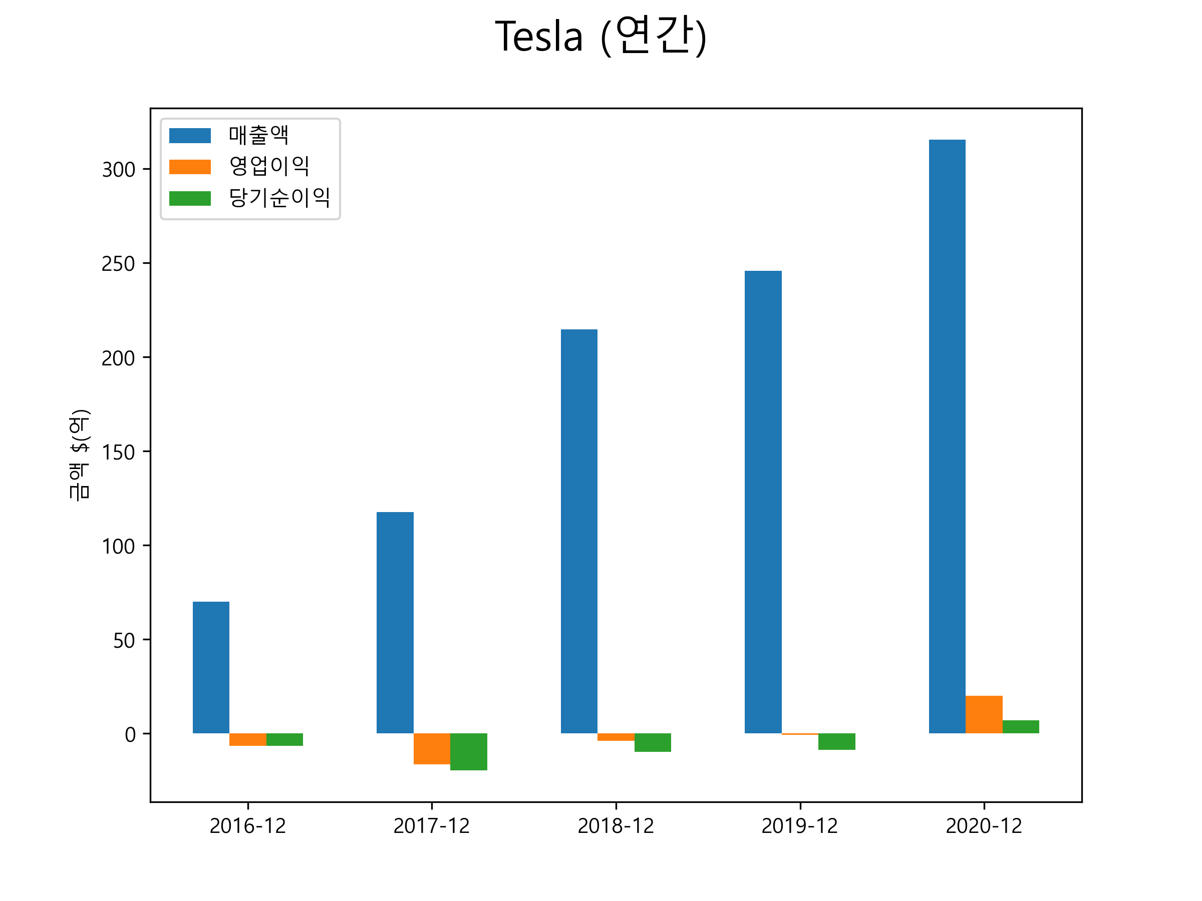 Tesla의 2020년 매출은 315.4억달러, 영업이익 19.9억달러, 당기순이익 6.9억달러을 기록했습니다. 처음으로 실적이 흑자 전환했습니다. 연간별 매출 및 영업이익, 당기순이익 표입니다.