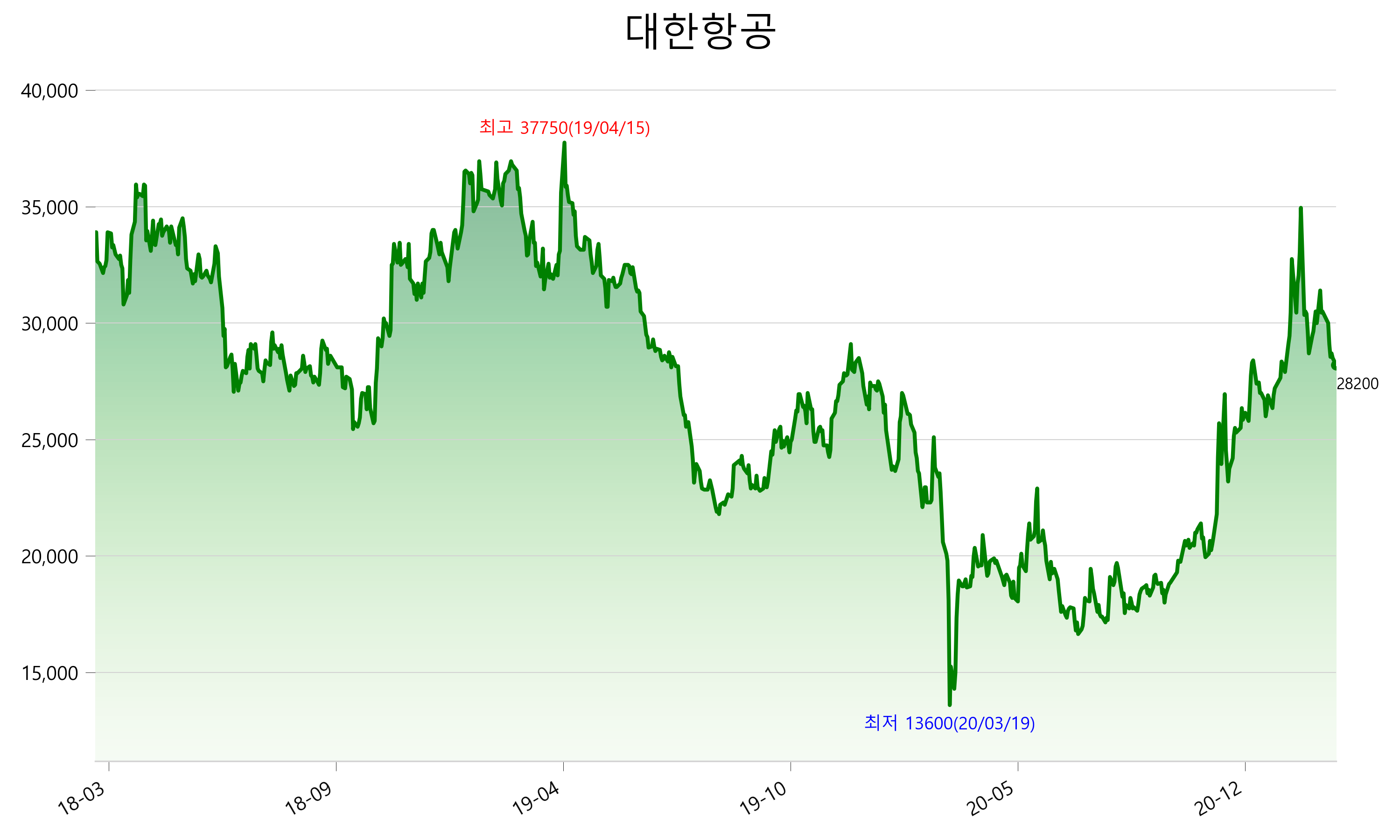 2021년 02월 22일 기준 주가는 28,200원 입니다. 아래는 최근 3년간의 주가흐름입니다.
